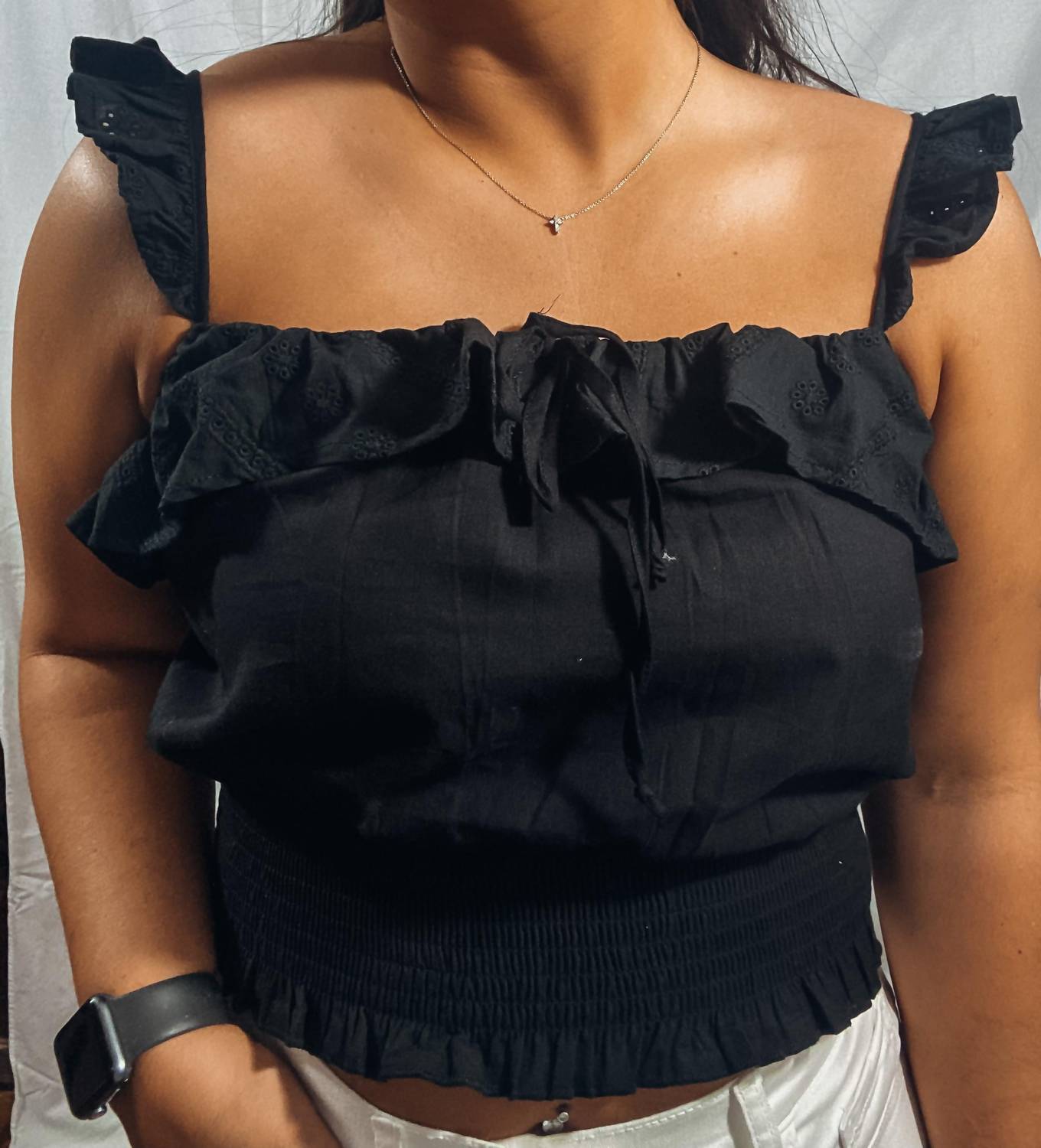 This classic tank top is perfect for layering and cute enough to wear on its own. Discover the Ruffled Up Tank by PAPERMOON, a chic black sleeveless piece perfect for any casual occasion. Featuring a stylish square neckline, this cropped tank ensures a flattering silhouette. The pull-on closure offers ease and simplicity while maintaining its stylish appeal. Model is wearing size Medium.
