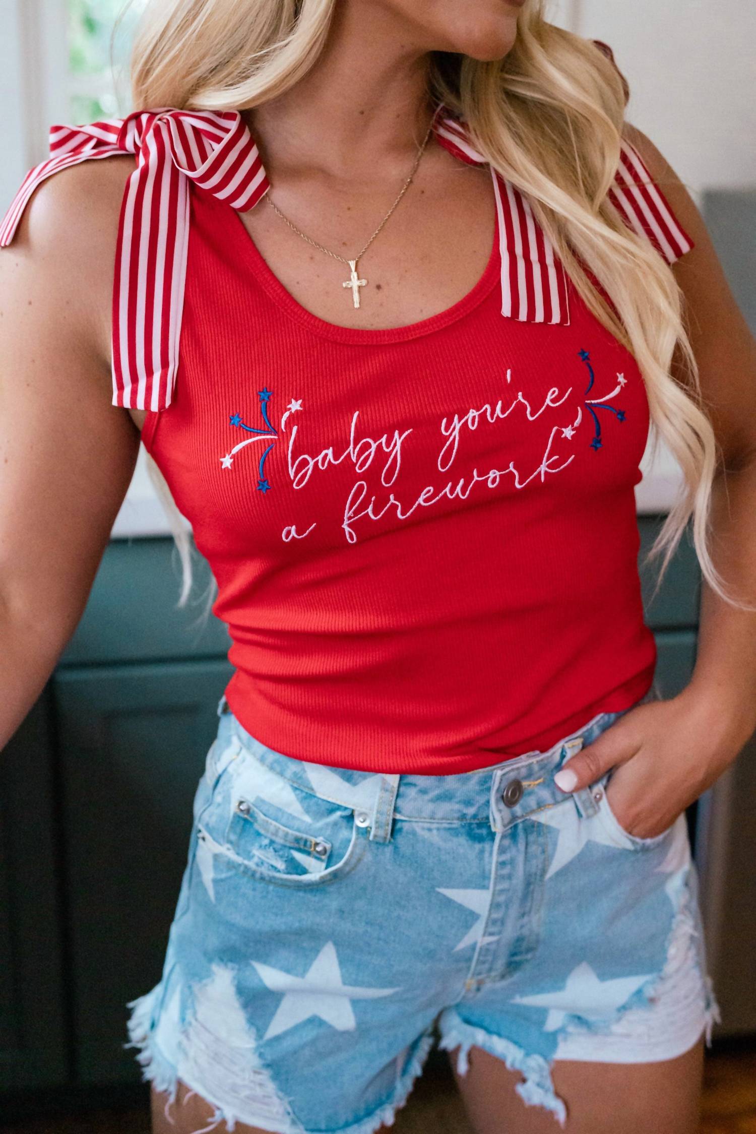 Fit, fabric and functionality. This tank top checks all the boxes. Meet the Peach Love Firework Tank Top, a vibrant red piece perfect for your holiday festivities. This sleeveless tank features a scoopneck and a patriotic graphic design, enhanced with embroidered quotes and decorative ribbon ties at the shoulder. It offers a tie closure for an adjustable fit. Care for your tank with machine wash and line dry instructions, and celebrate in style.