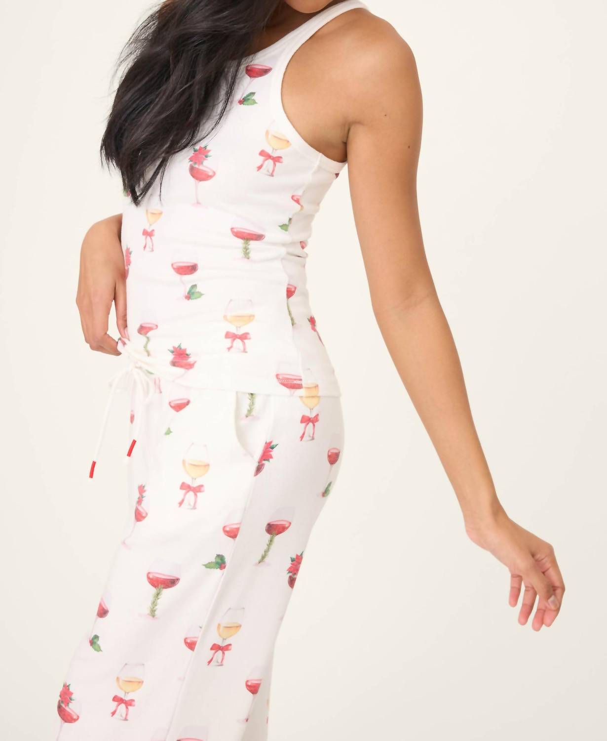 Fit, fabric and functionality. This tank top checks all the boxes. Celebrate cozy season in the PJ Salvage Lets Get Toasty Holiday Wine Print Tank Top, a charming piece adorned with festive champagne glasses. This sleeveless tank comes in a chic ivory color and features a scoop neckline for added style. Crafted from polyester, it boasts a racerback design with sporty straps, ideal for layering or pairing with casual bottoms. Closure is a convenient pull on, and it's best maintained with a hand wash.