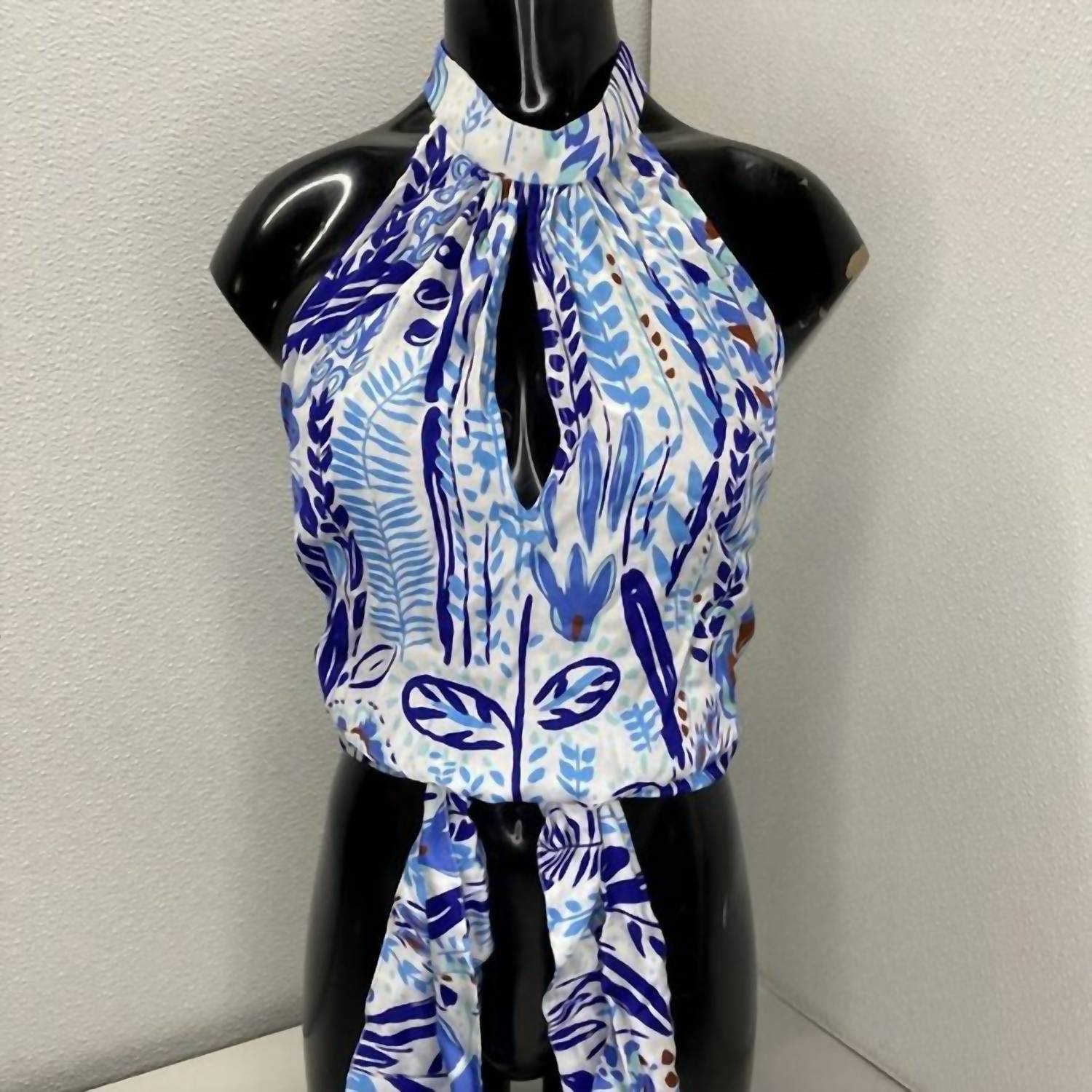 Pair this crop top with your favorite high-waisted jeans or maxi skirt. Introducing the Women's Clea Halter Cropped Top by Poupette St Barth, a breezy and bohemian-inspired piece perfect for sun-drenched adventures. This sleeveless top, crafted from 100% viscose, features a vibrant blue and white multi-color leaf print, with a halter neck, keyhole opening, and tie closures for an adjustable fit. Made in Indonesia. Boasts a cropped length and elasticated hem for a loose and relaxed silhouette, making it an ideal addition to your summer wardrobe. Hand wash only.