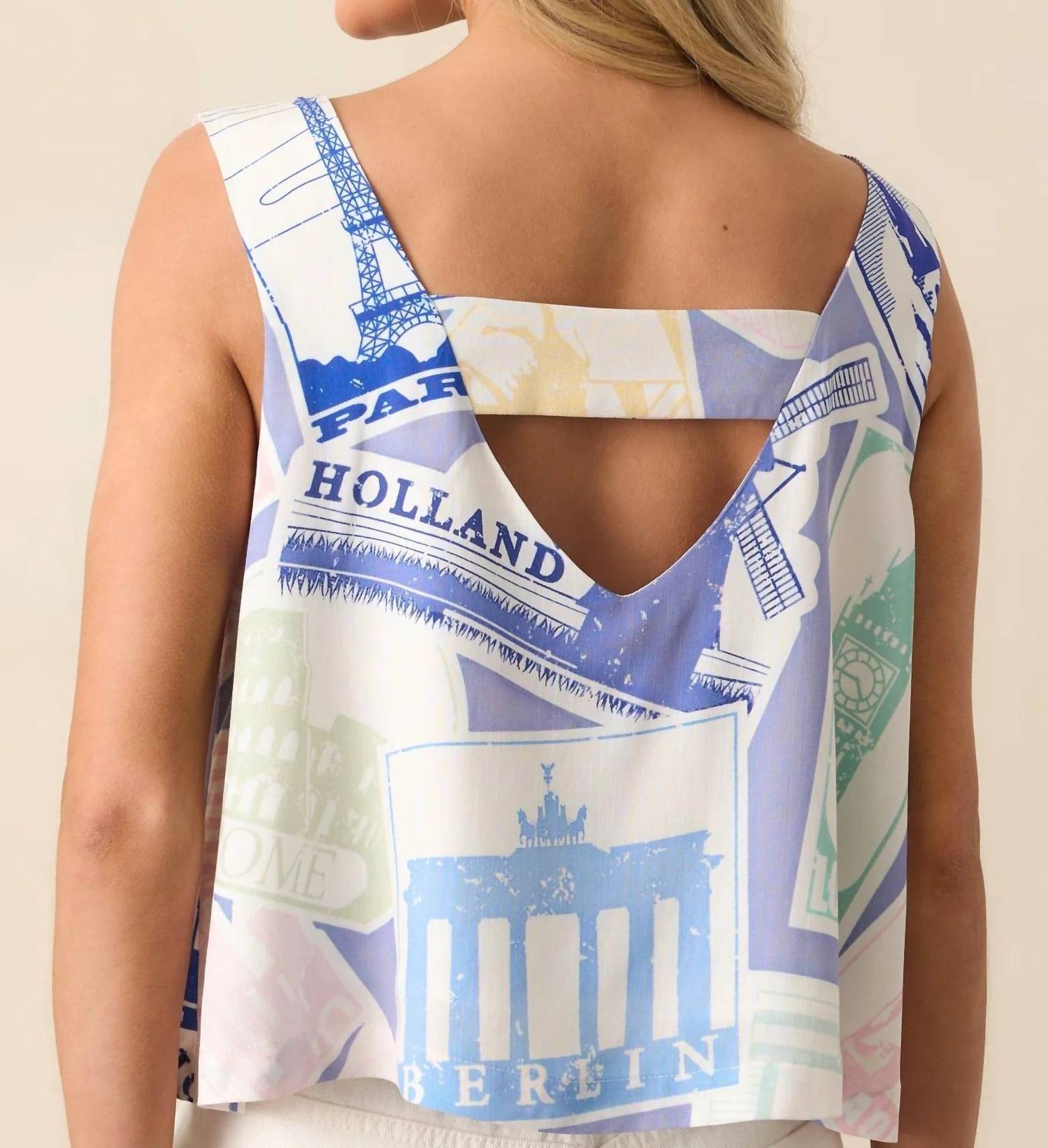 Pair this crop top with your favorite high-waisted jeans or maxi skirt. Elevate your summer wardrobe with the Lola Crop Top by Prosperina, a vivid Passport Blue Print piece that invites a sense of adventure. Crafted from 100% rayon, this sleeveless square-neck top features an exclusive graphic print and a modern cropped length with a captivating back cutout detail. Manufactured in China and designed in the USA, this pull-on number is perfect for vacation vibes. For best care, hand wash inside out with cold water, avoid bleach, and air dry. Model is 5'8" and is wearing an X-small.
