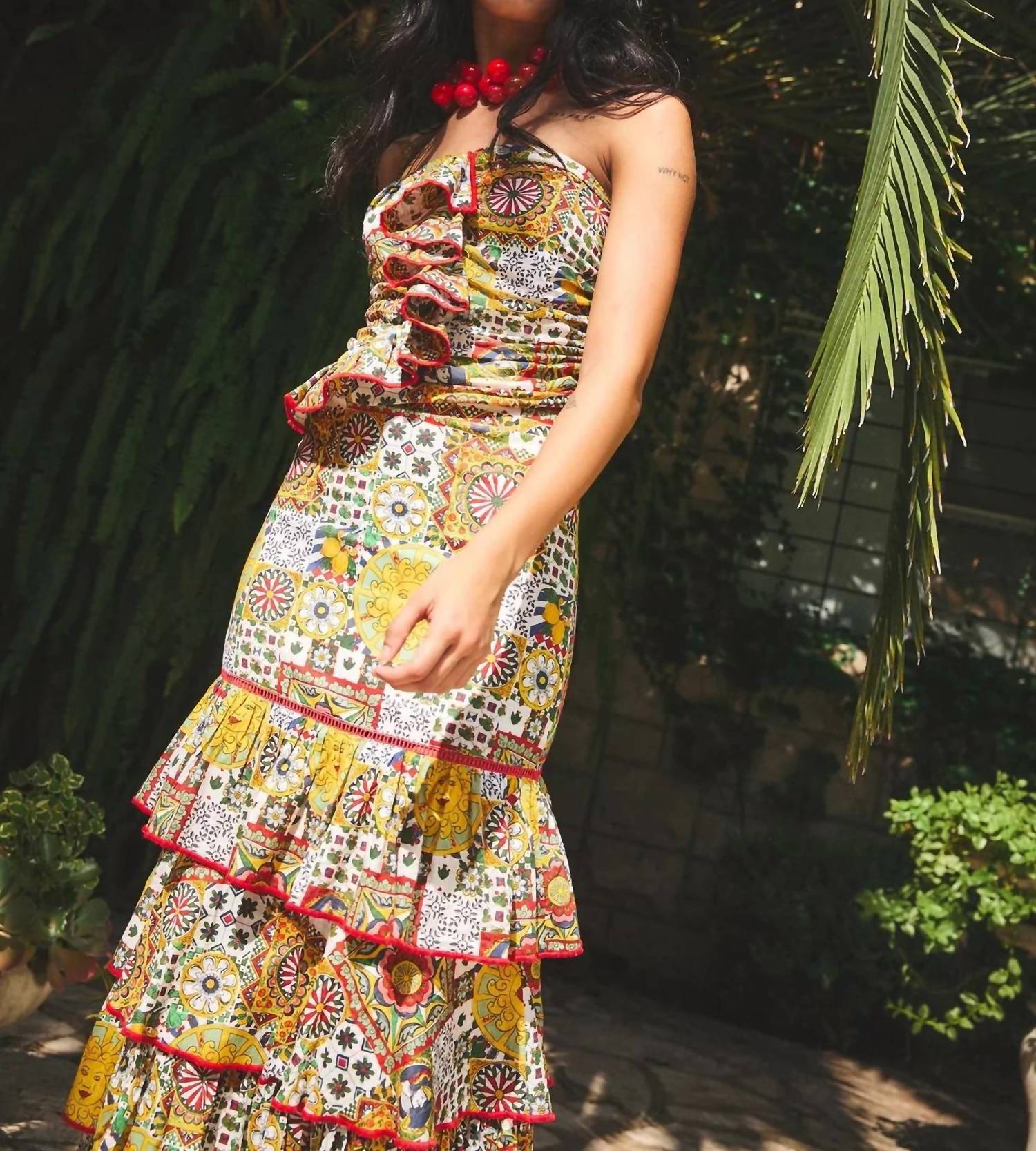 Show a little skin in this cute and casual crop top. Introducing the Hidalgo Top by RO'S GARDEN, a vibrant staple in Yellow Napoli with a chic Boho pattern perfect for summer getaways. This strapless, sleeveless crop top features a sophisticated square neckline and a convenient side zip closure for easy wear. Composition: 100% Cotton. Length from shoulder to hemline is 10.5 inches. Ideal for a stylish vacation look.