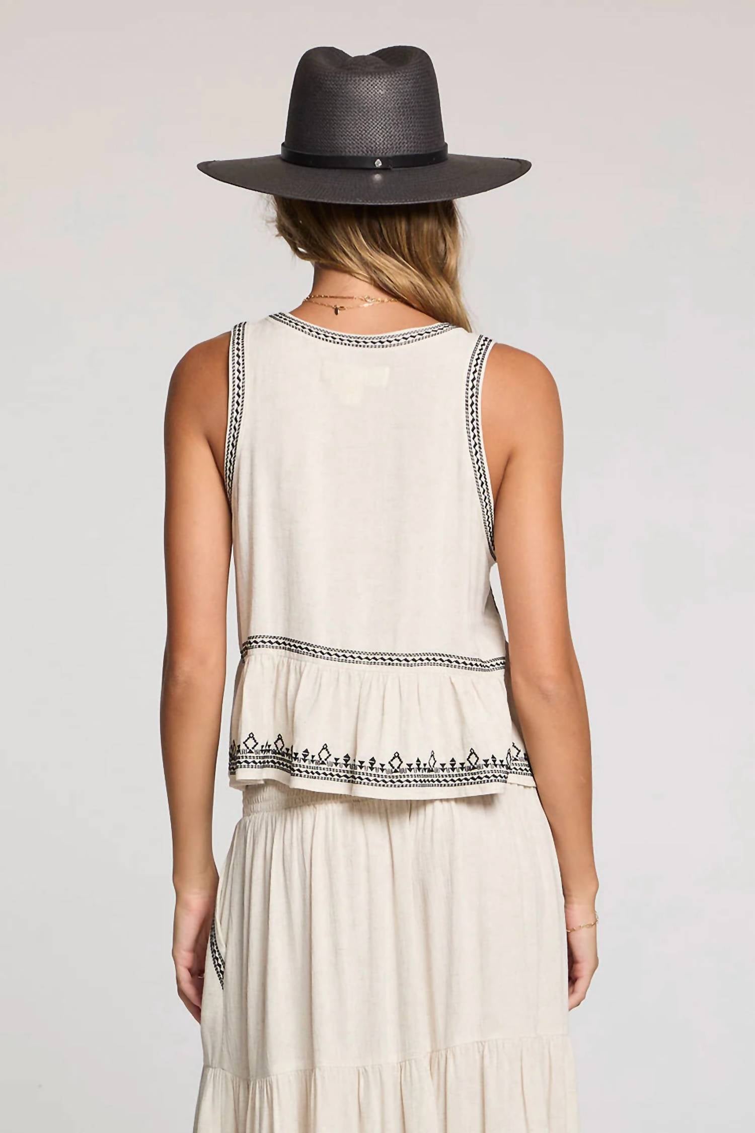 This classic tank top is perfect for layering and cute enough to wear on its own. Discover the Quinley Natural Tank by Saltwater LUXE, an ideal choice for your summer escapades. This sleeveless top features a luxurious scoopneck with a natural beige hue, embellished with petite black Moroccan-inspired patterns. Crafted from a linen blend of 80% rayon and 20% linen, it offers a breezy, flowy silhouette perfect for warm days. Closure is secured with buttons, ensuring ease and style for any holiday party or casual outing.