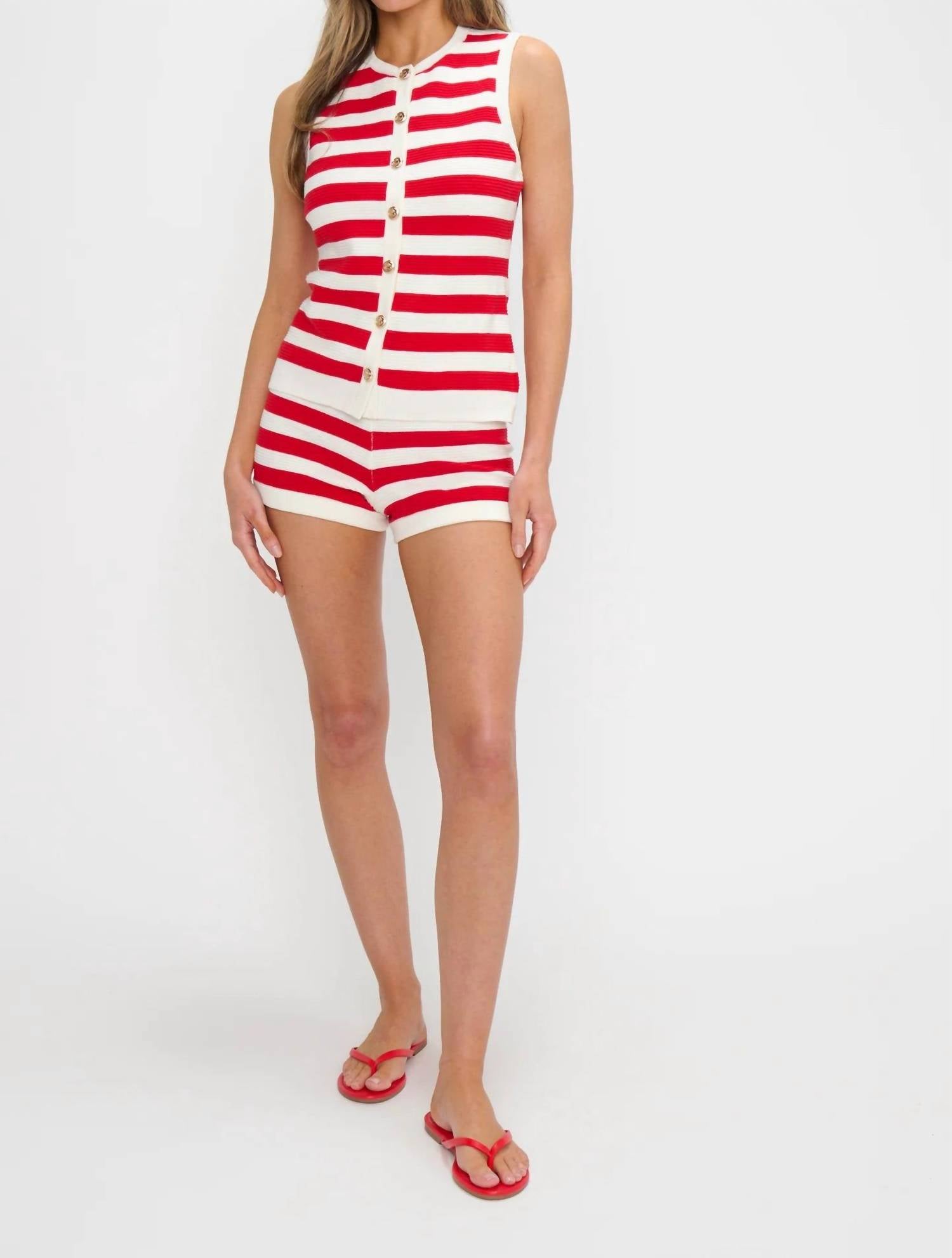 Fit, fabric and functionality. This tank top checks all the boxes. Elevate your wardrobe with the Devin Tank Delight Knit Top by Show Me Your Mumu, a preppy essential in striking red stripes. This sleeveless knit top features a crewneck design and is accented with elevated gold buttons for a polished finish. Closure: Button closure. Care: Machine wash and lay flat to dry, ensuring longevity and vibrancy of the fabric.