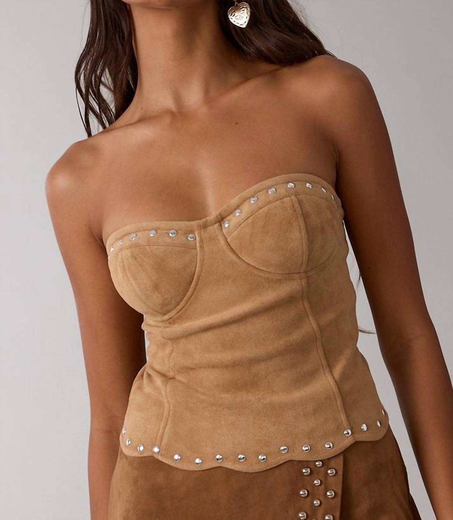 Pair this crop top with your favorite high-waisted jeans or maxi skirt. Introducing the Faded Tube Top by Sky to Moon, a standout piece perfect for making unforgettable style statements. This strapless crop top features a sweetheart neckline and is crafted from soft suede-textured 100% polyester with bold studded detailing for a rock-chic vibe. Designed with a secure zip closure, it offers a snug fit that hugs your curves without compromising comfort. Care instructions include hand wash cold and line dry to maintain its luxe appeal.