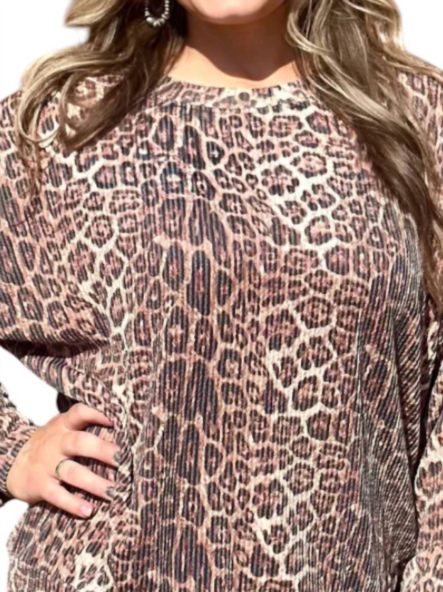 Pair this crop top with your favorite high-waisted jeans or maxi skirt. Introducing the Hear Me Roar Sweater Top by Sterling Kreek, a bold addition to your wardrobe with a long-sleeve, crewneck design in an alluring brown multi cheetah print. Crafted from 67% Polyester, 25% Rayon, and 8% Spandex, this oversized crop top offers unmatched comfort with a trend-setting maximalist appeal. Its viral ribbed material ensures you stay cozy while turning heads on vacation or during casual outings. Designed with a pull-on closure for ease, this piece celebrates stylish versatility; care for it by hand washing and line drying for longevity.