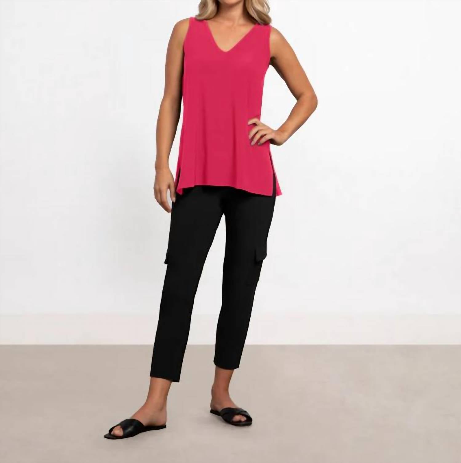 Fit, fabric and functionality. This tank top checks all the boxes. Experience the Sympli Reversible Go To Tank Relax Top in a vibrant Watermelon hue, ideal for your summer travel adventures. This sleeveless top is crafted from a soft jersey fabric, made of 94% polyester and 6% spandex, ensuring both comfort and a relaxed fit. It features a unique neckline that can be reversed from a U to a V, with a tonal jersey trim adding a classic touch. Proudly made in Canada and designed for easy care, simply machine wash, line dry, and iron at a low temperature for effortless maintenance.