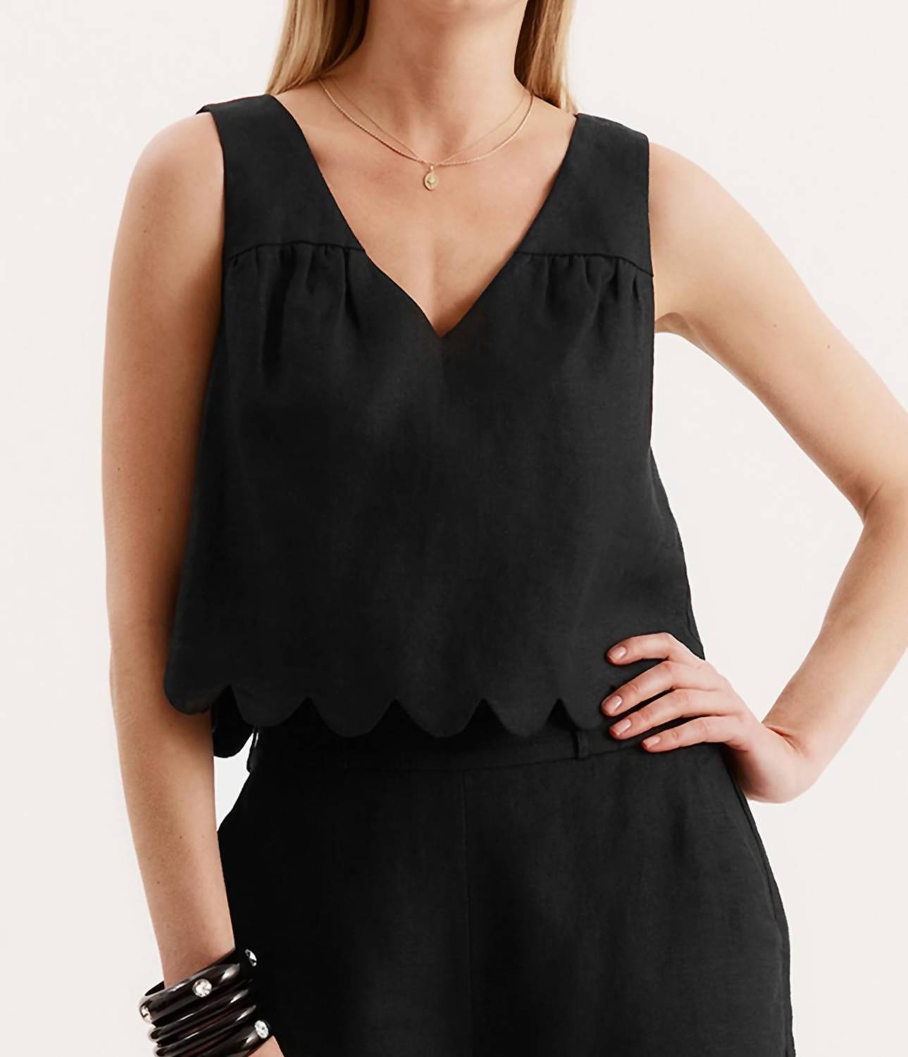 The perfect tank top for those warmer weather seasons. Elevate your summer wardrobe with the Emery Scalloped Top by Tyler Boe, a chic sleeveless piece in a timeless black shade. Crafted from 100% linen with a smooth cotton lining, this top ensures breathability while keeping you comfortable and cool. It features a flattering V-neckline and a stylish scalloped hem, perfect for a sophisticated yet relaxed look. Designed for easy wear with a pull-on closure, this top is machine washable and should be line dried for optimal care.