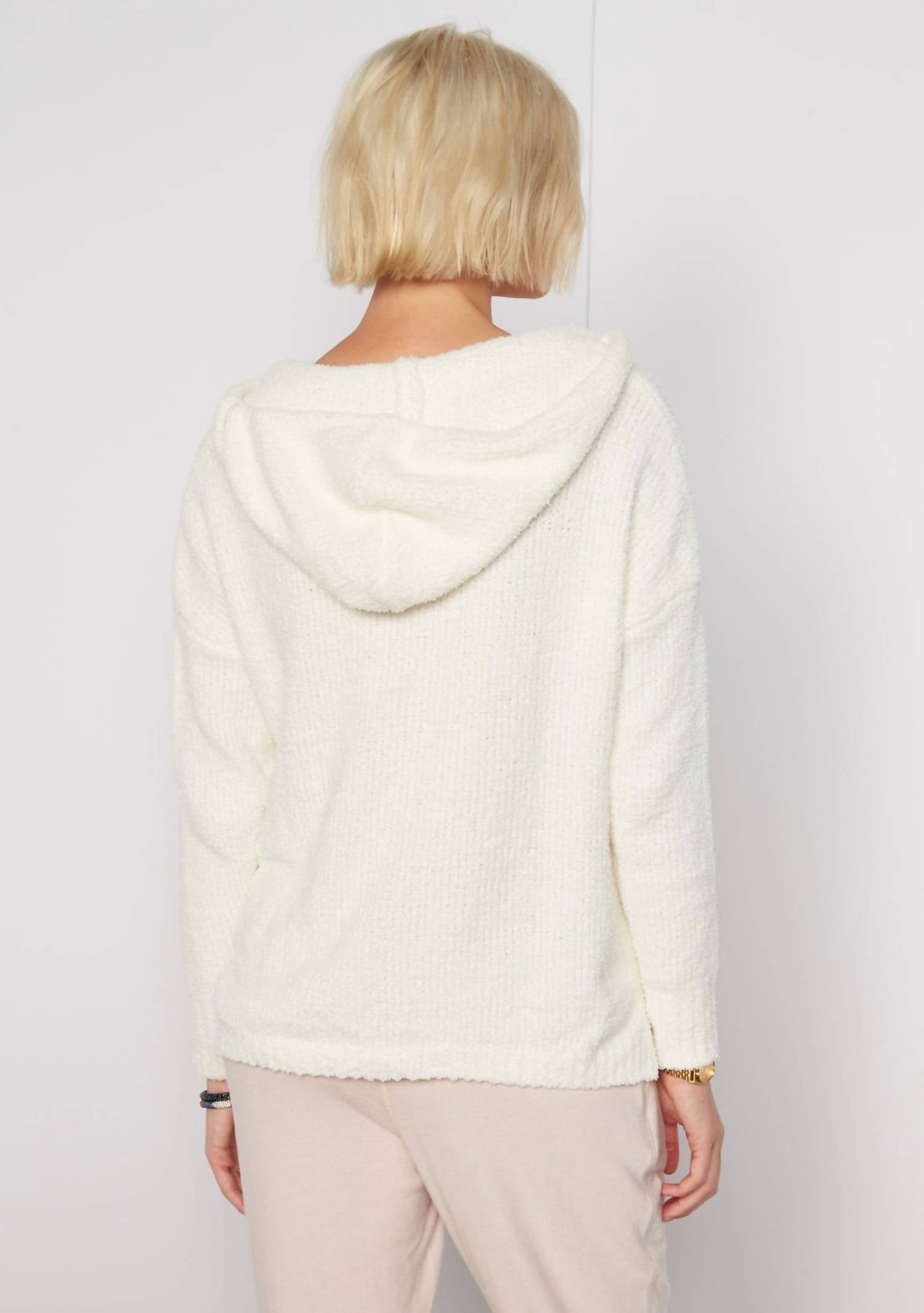 Whether you're running around town or lounging at home, this sweatshirt works for both. The Chance Hoodie by Tart Collections is a must-have hybrid that's equal parts sweater and hoodie, designed in a chic Sea Salt color. This women's piece features cozy long sleeves and is made from plush, 100% polyester knit, ensuring warmth without bulk. It offers a convenient pull-on closure and is meant for dry cleaning only, making maintenance simple. Model is wearing a size x-small (5'10.5" height, 32.5" bust, 23.5" waist, 34.5" hip).