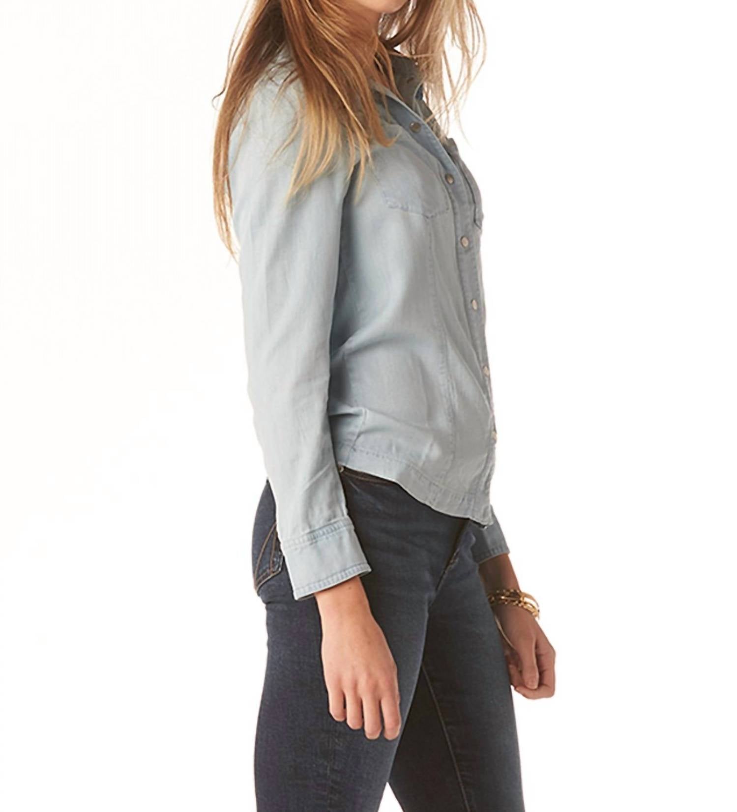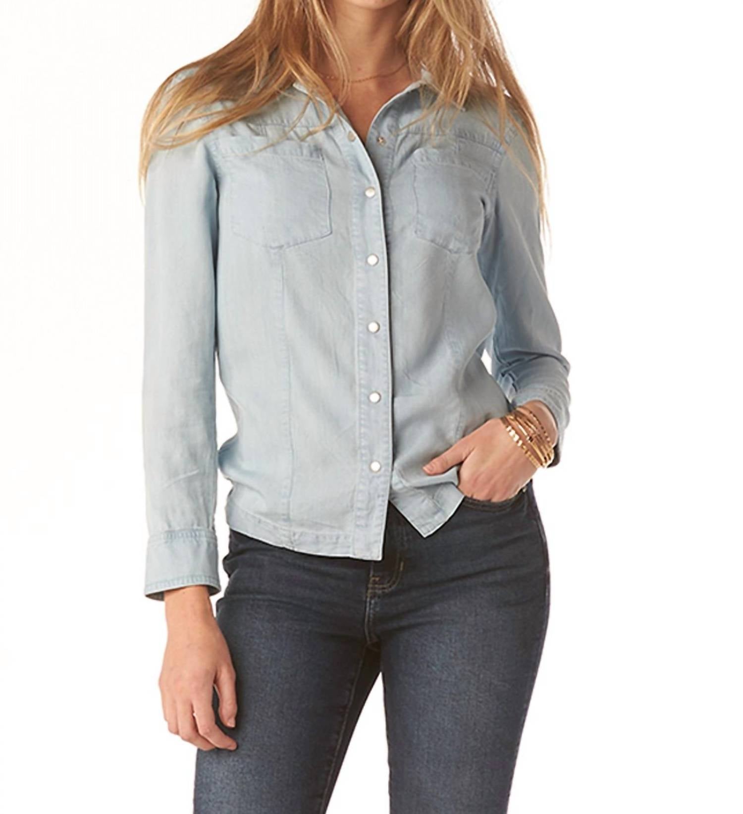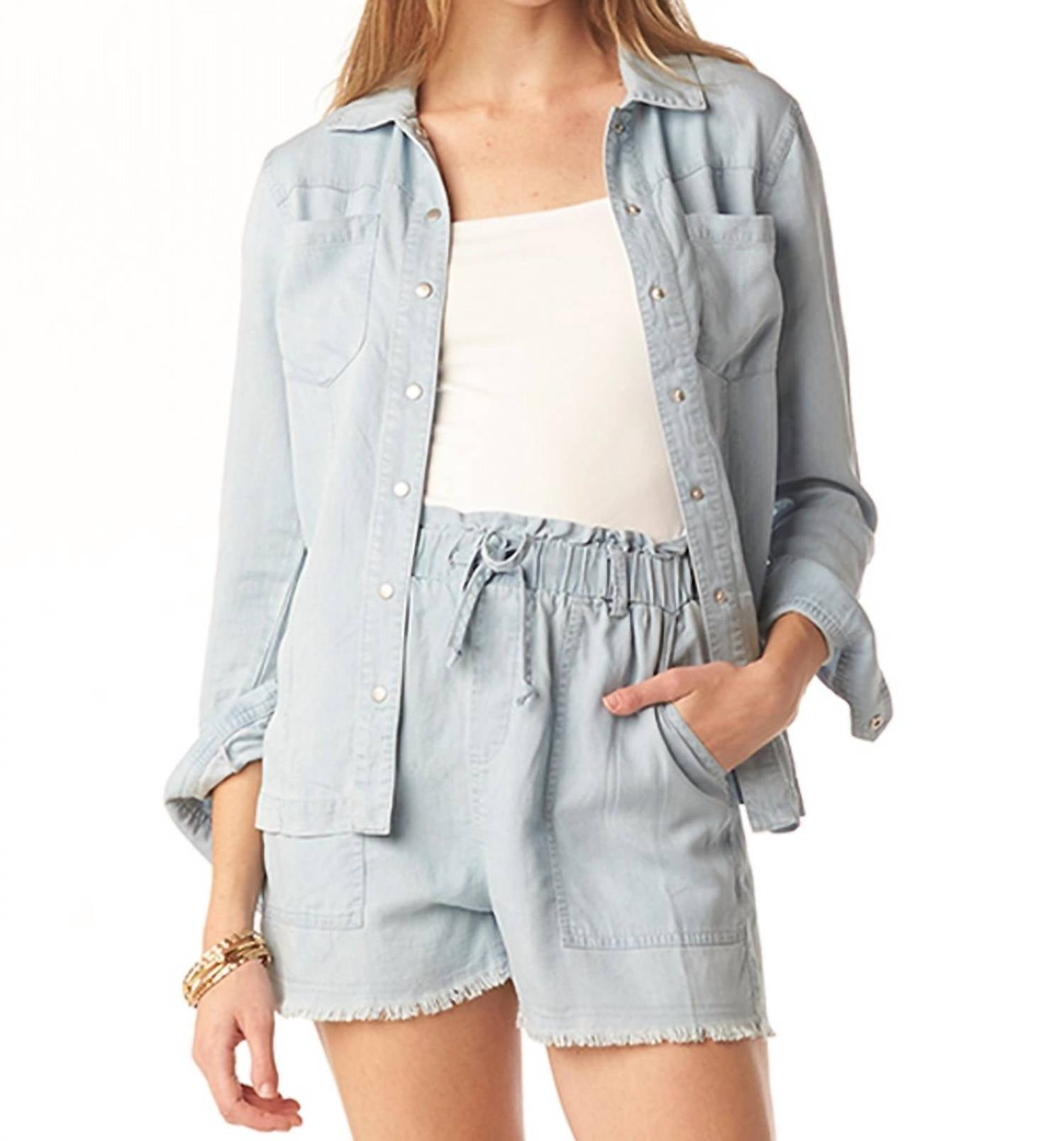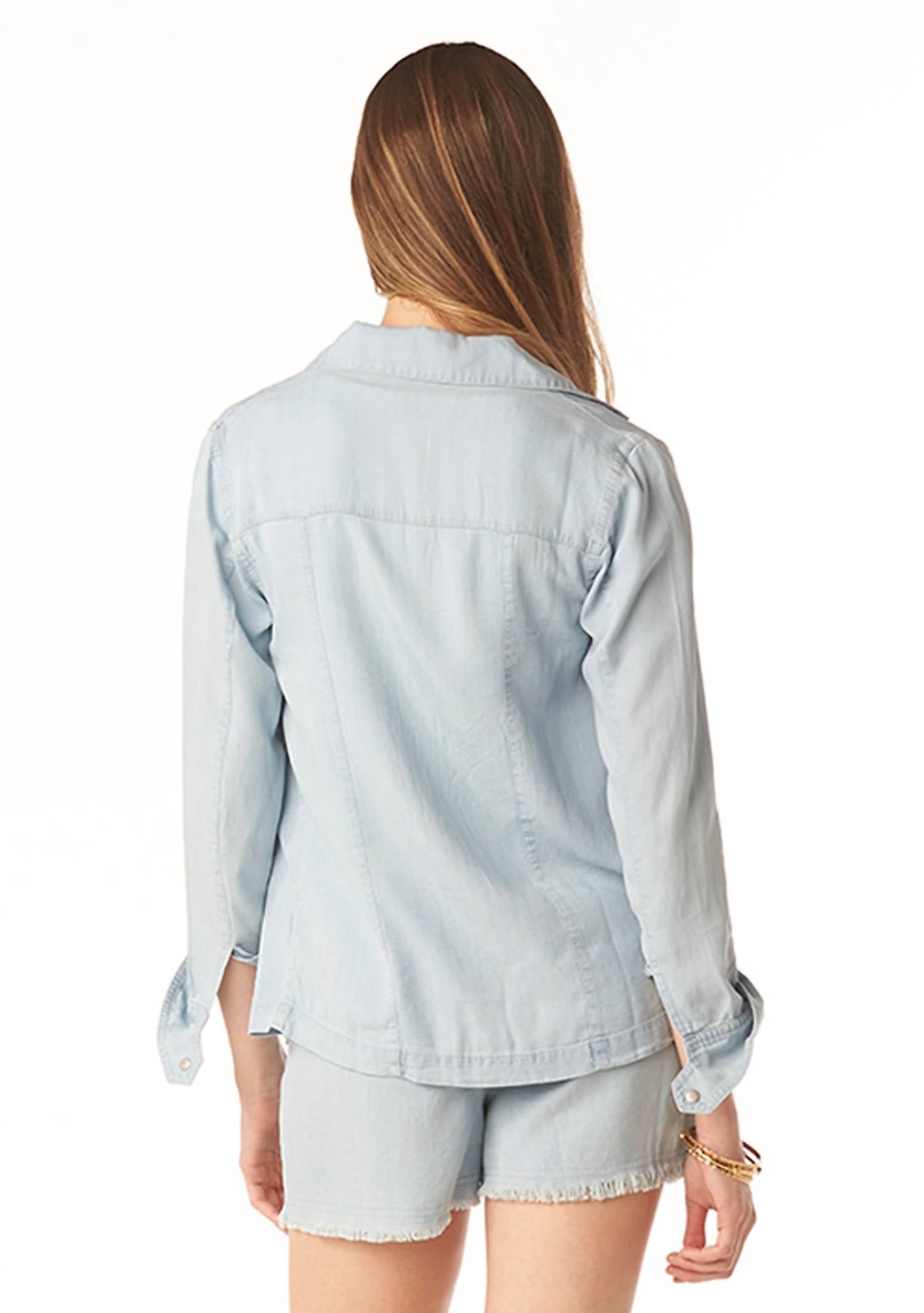 The Francesca Shacket by Tart Collections is a stylish addition to any wardrobe, crafted from 100% Tencel in a classic Open Air Blue with a solid pattern. This long sleeve button-down shirt combines versatility and timeless appeal, featuring a collar neckline. Closure type: Button Closure. Care: Machine wash cold on a delicate cycle, use mild detergent, do not bleach, lay flat to dry; low iron if needed or dry clean. Model is 5'8" and wearing a size X-small.