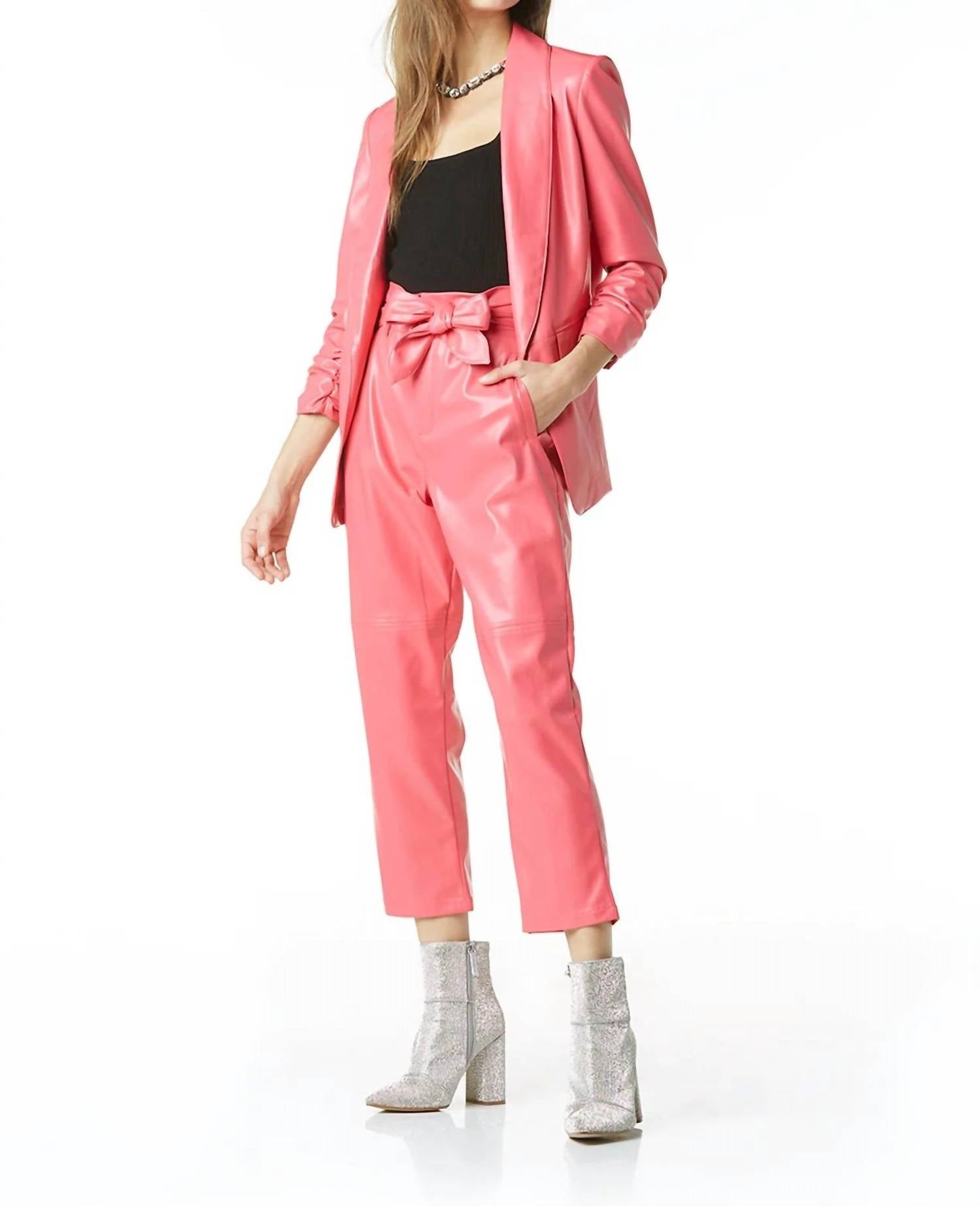 Ruched sleeves. Hip length. Vegan leather. 60% polyurethane 40% viscose. Machine wash cold inside out.