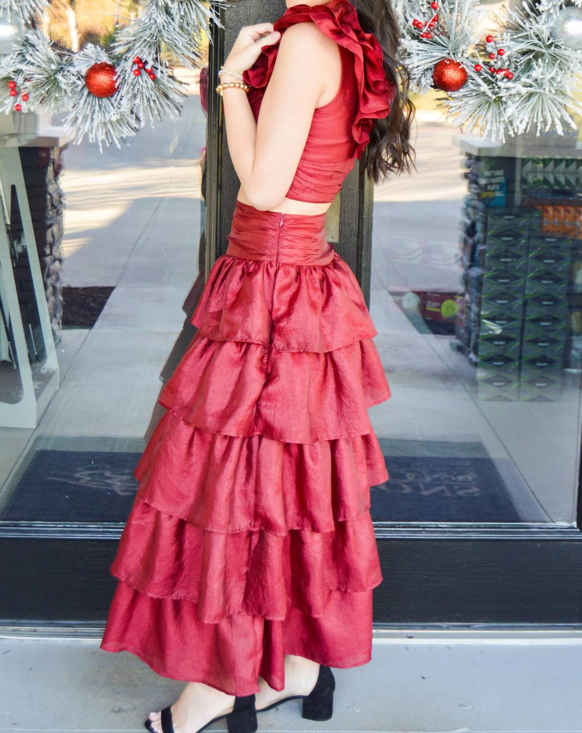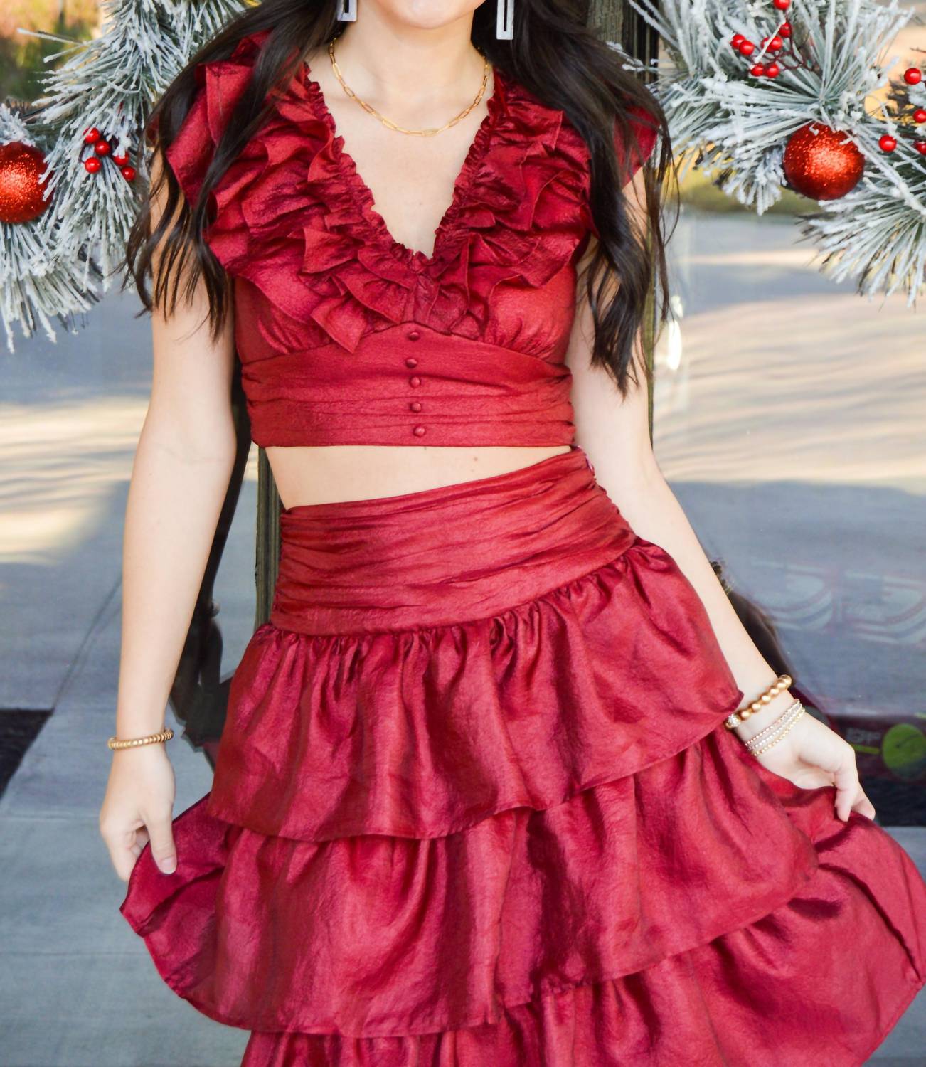 Pair this crop top with your favorite high-waisted jeans or maxi skirt. A striking sleeveless crop top, crafted with shiny fabric and finished with romantic ruffle detailing, it's perfect for elevating any ensemble. Feminine V-shaped neckline and faux button accents add charm, while a convenient zip closure at the back ensures easy wear.