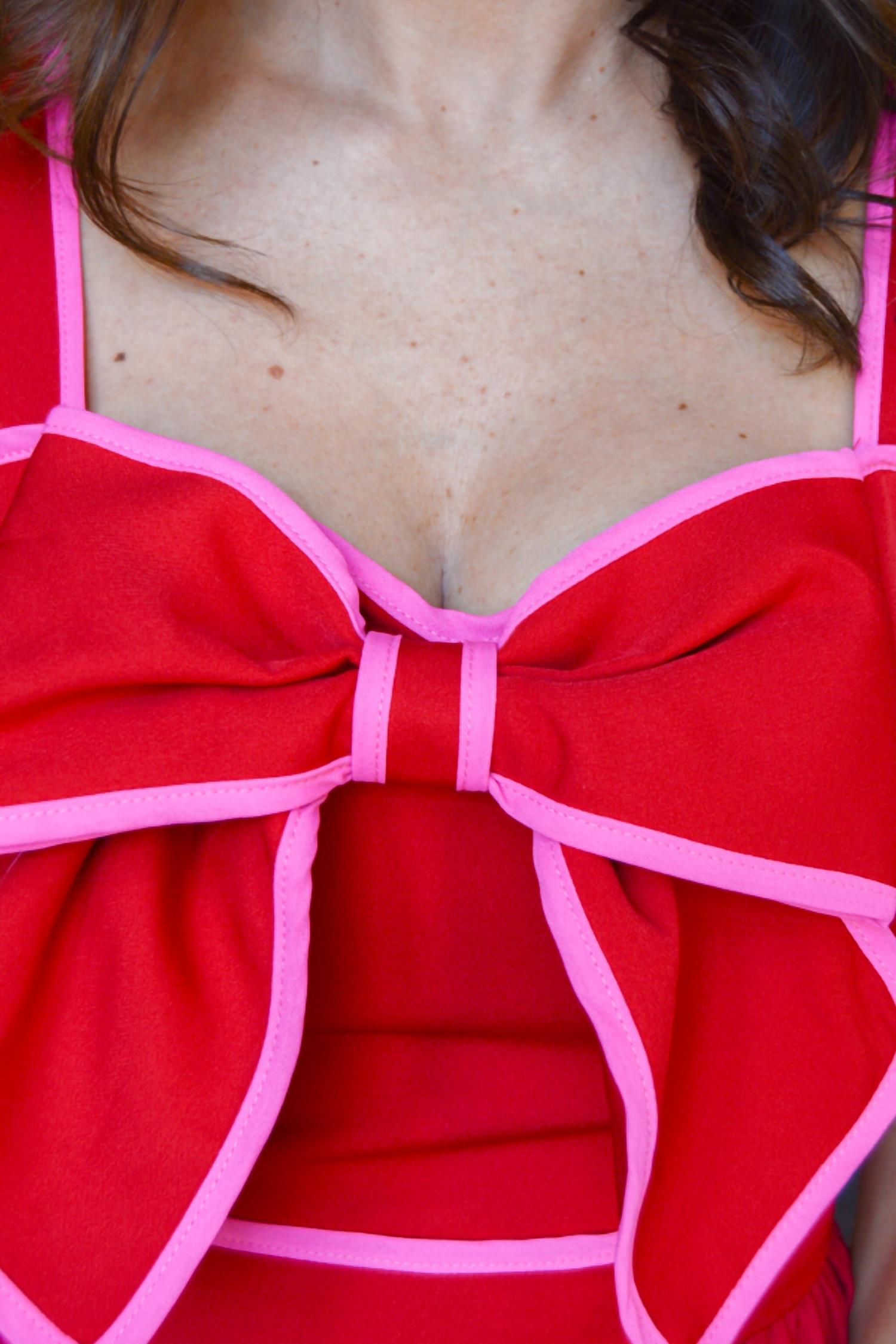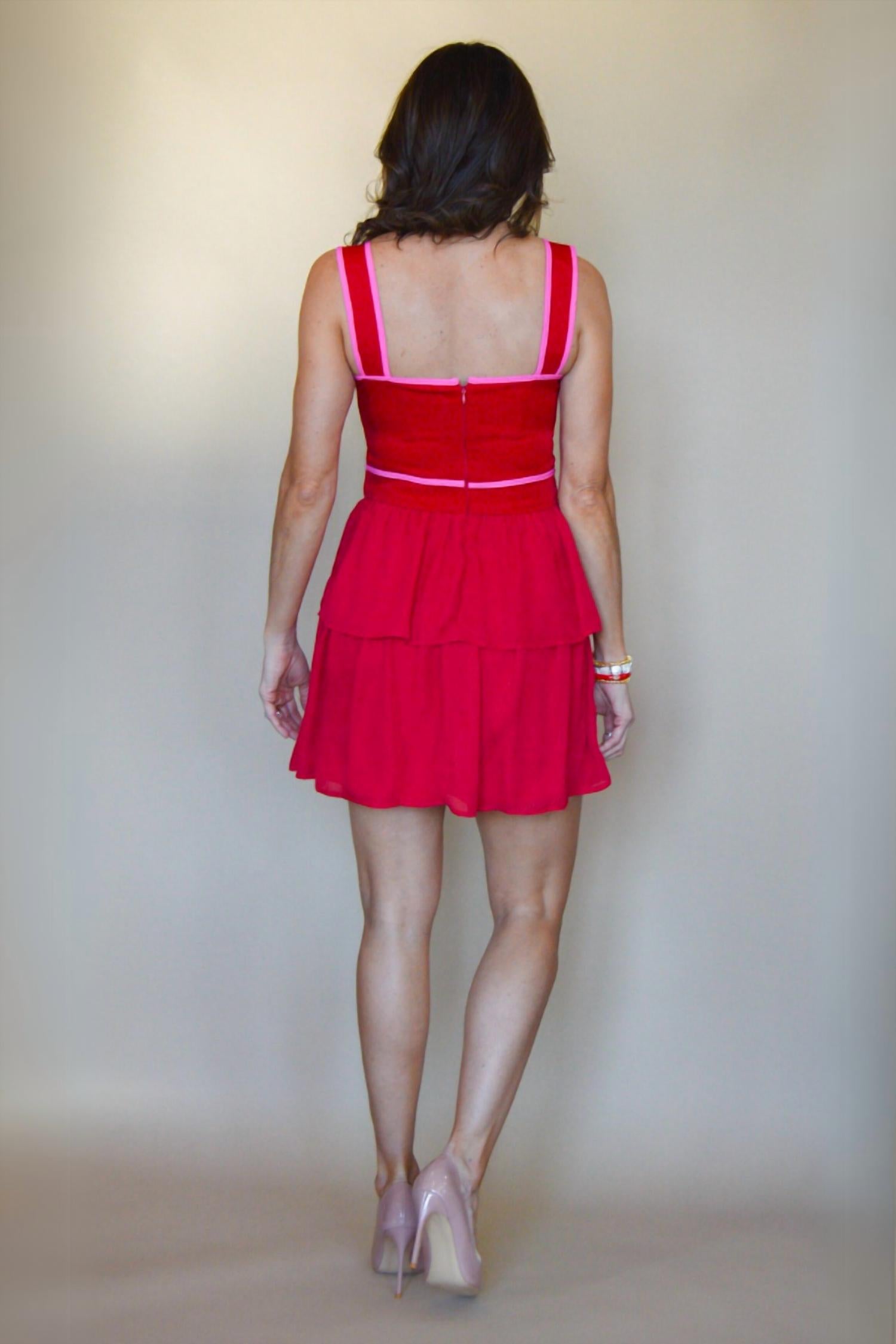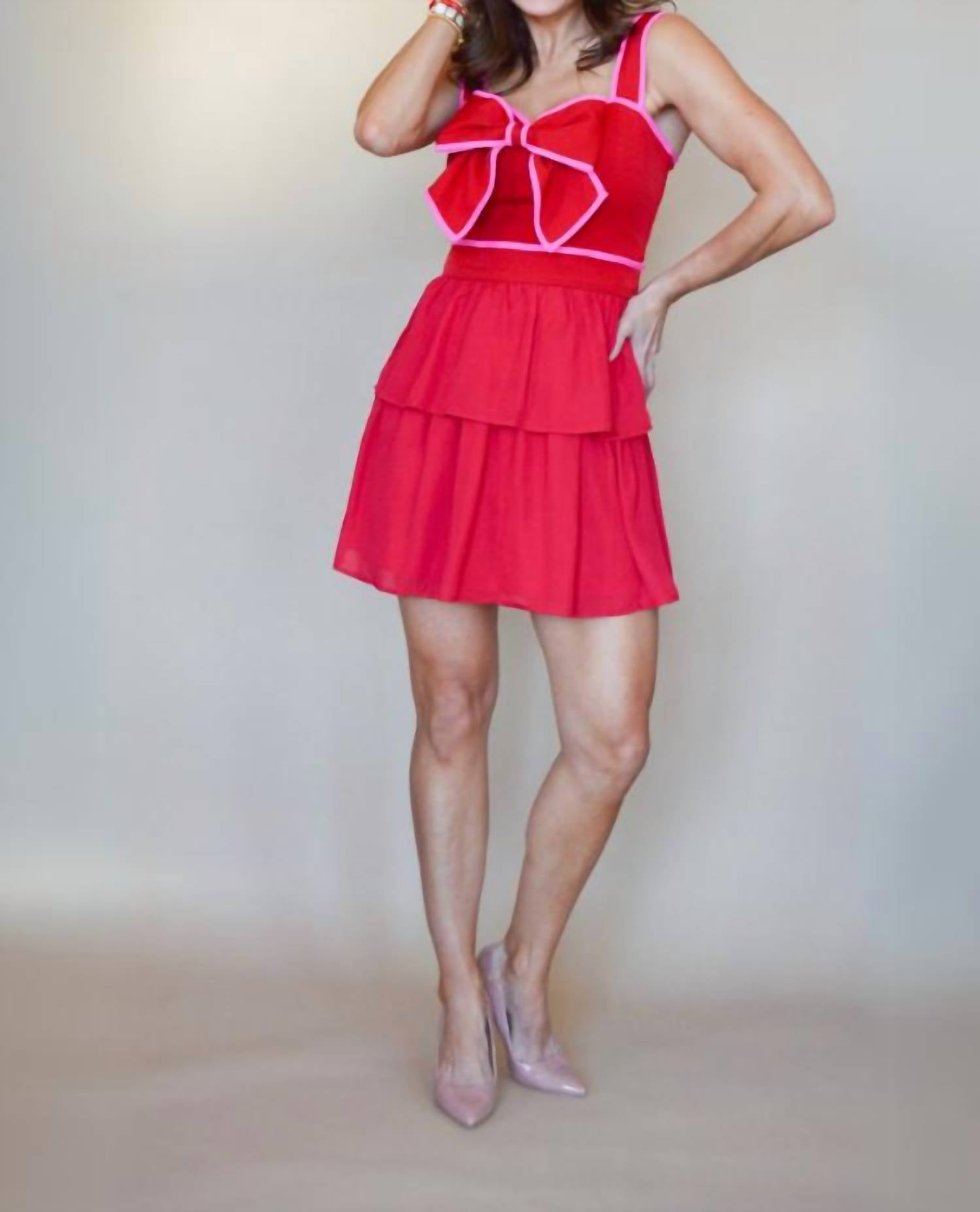 A short and breezy dress for those warmer days. This sleeveless dress features a sweetheart neckline, adorned with a charming bow tie that enhances its feminine allure. Completed with a ruffled tiered skirt for lively movement, and a back hidden zip closure for a seamless finish.