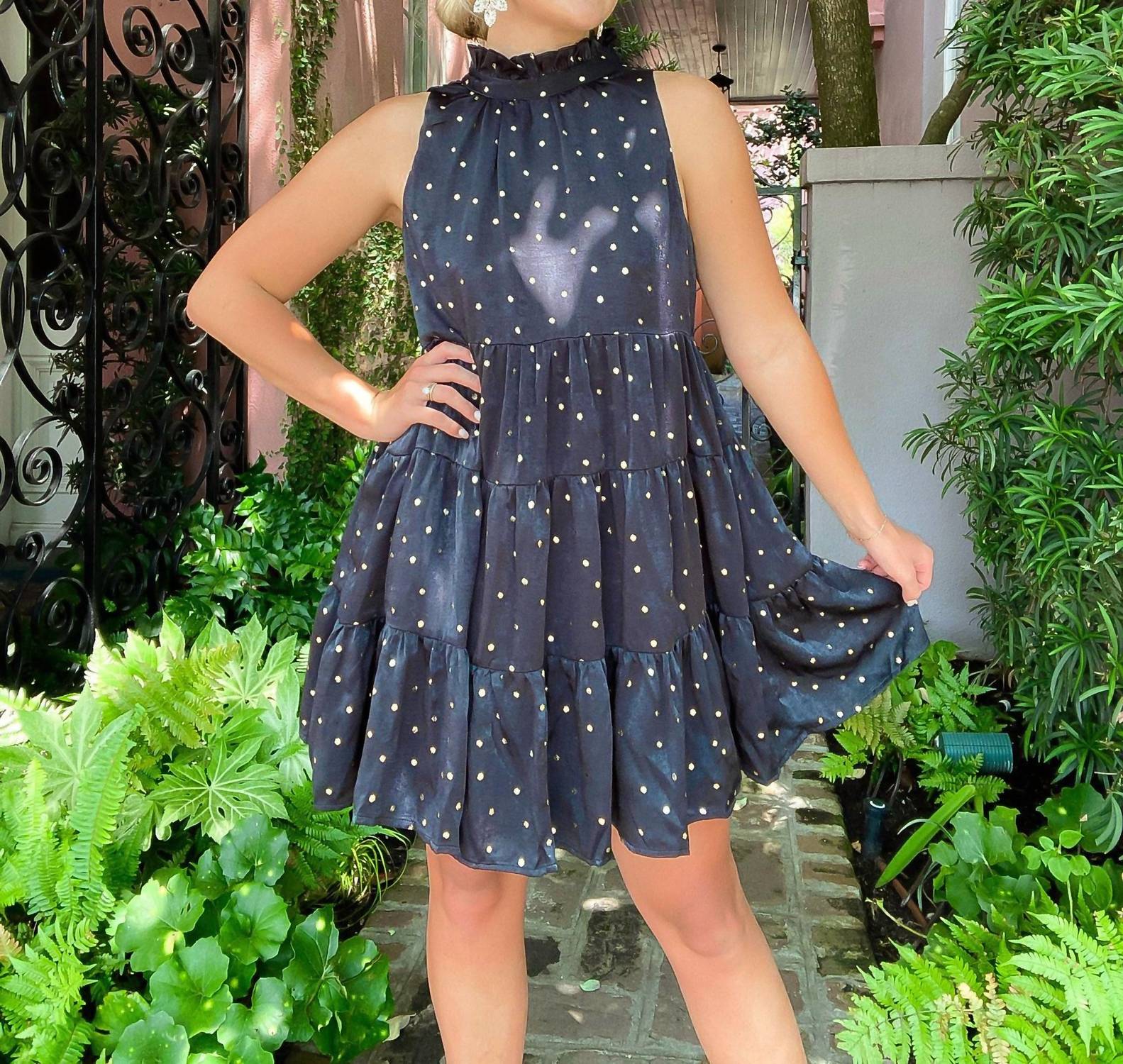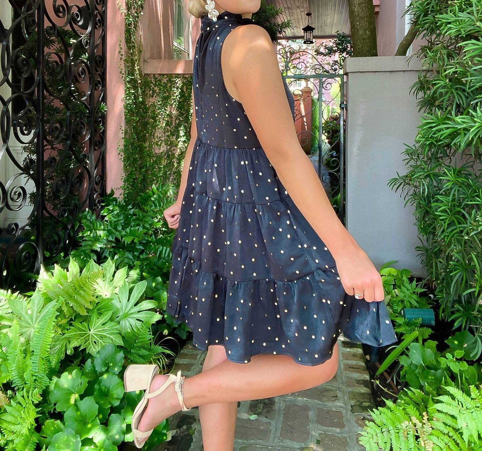 A short and breezy dress for those warmer days. Introducing the "Breakfast at Tiffanys" Shimmer Gold Polka Dot Dress by TCEC, a standout piece perfect for any evening event. This sleeveless mini dress features a ladylike mockneck and an elegant A-line silhouette, all accentuated by a sateen sheen and sparkly gold polka dots. Ideal for a summer New Year's Eve celebration, this dress embodies the "Quiet Luxury" trend.