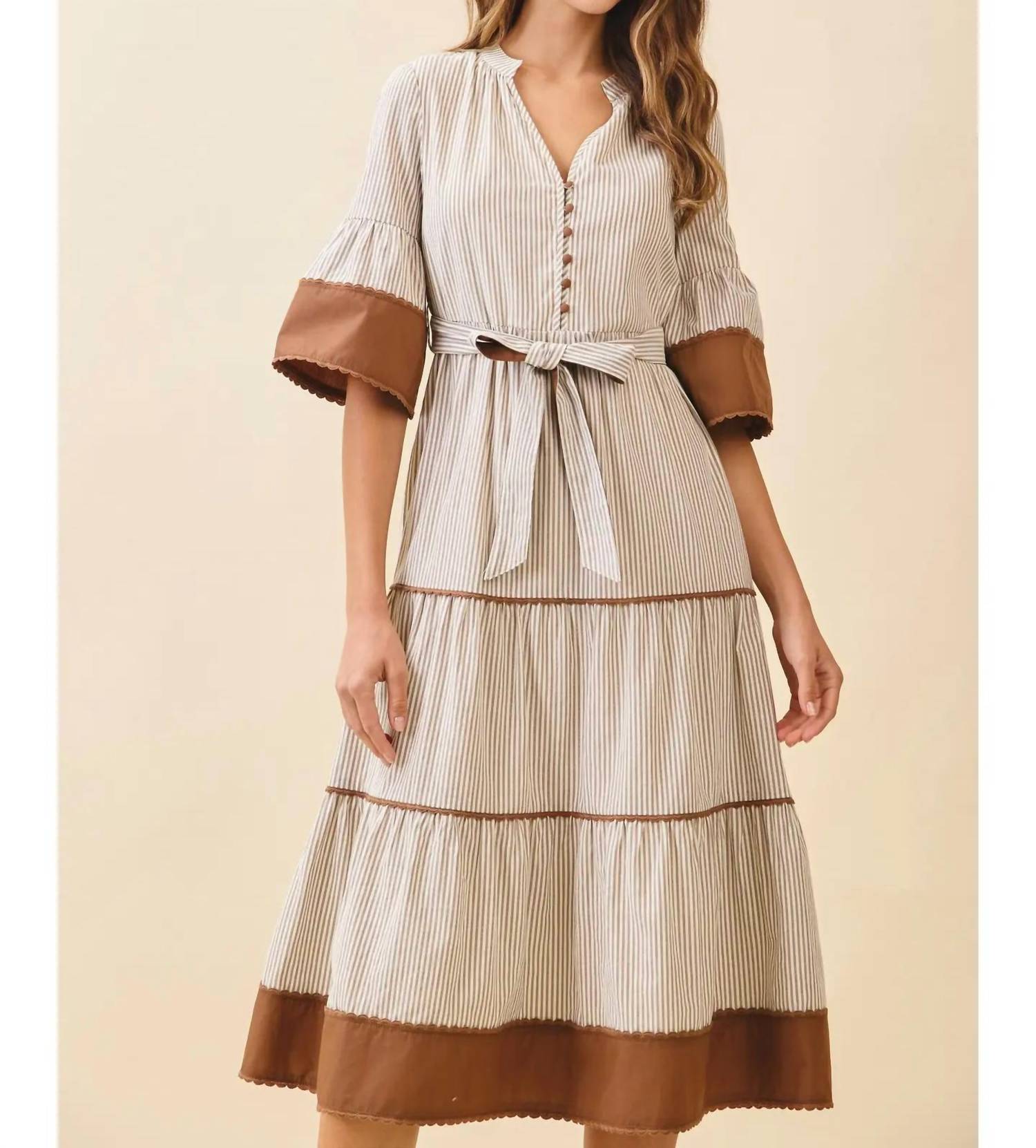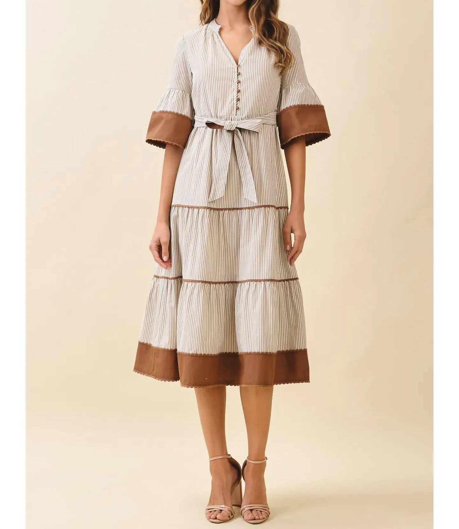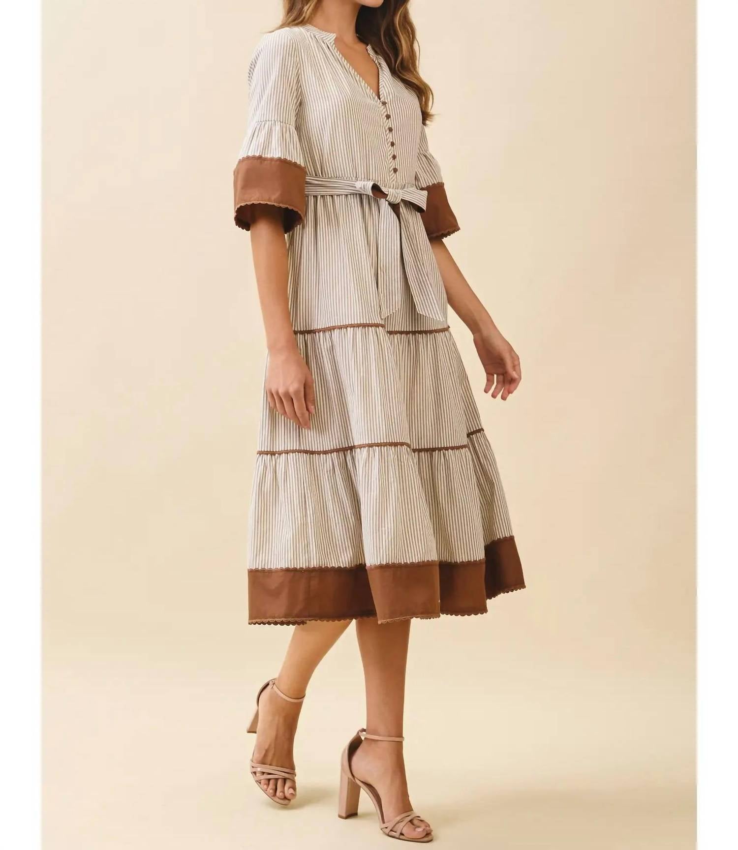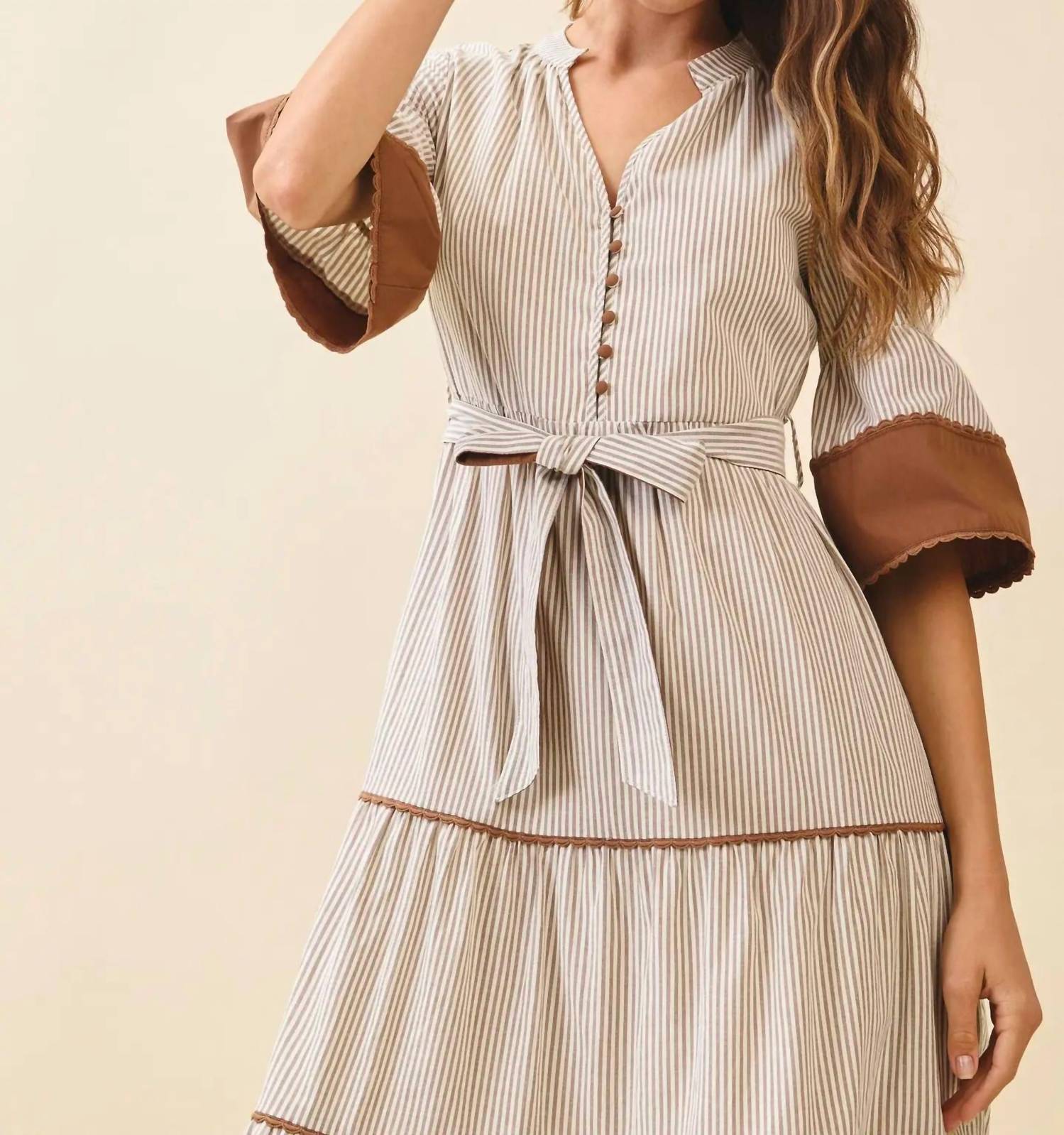 A midi dress so versatile, your options for wearing it are endless. The Contrast Trim Midi Dress by TCEC exudes elegance with its striped pattern and flowing design. This beige midi dress features elbow-length flounce sleeves and a split neckline, enhanced by a button-down bodice and contrast solid trims. The tiered panels and detachable self-tie belt add a flattering shape, while the flared hemline completes the look. Closure: Button closure. Model is wearing a size small (5'11" height, 31.5" bust, 23.5" waist, 35" hips).