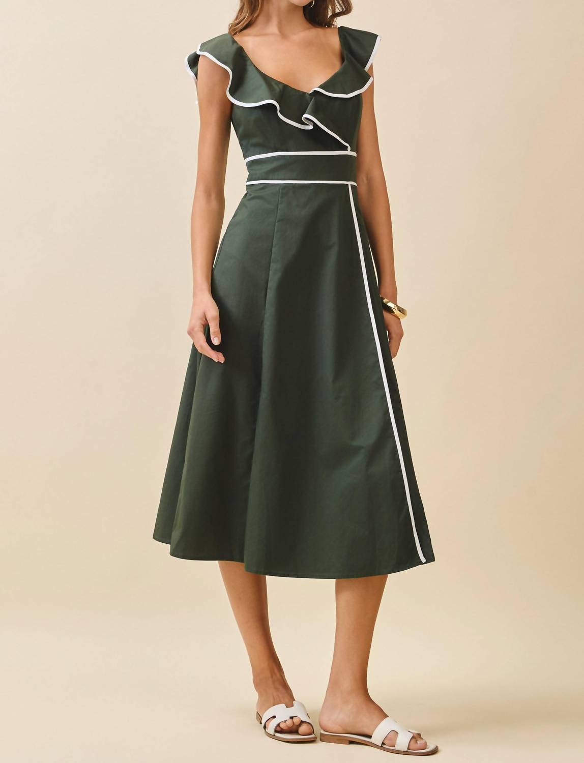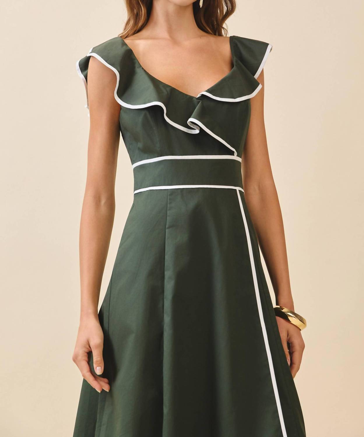 A midi dress so versatile, your options for wearing it are endless. Discover the TCEC Hunter Midi Dress in a vibrant green, perfect for cocktail party elegance. This sleeveless A-line dress showcases a scoop neckline adorned with ruffled contrast trim and wide shoulder straps. With a fitted bodice featuring piping detailing at the waist, it ensures a flattering silhouette. Closure: Side zipper. Care: Machine wash for easy maintenance.