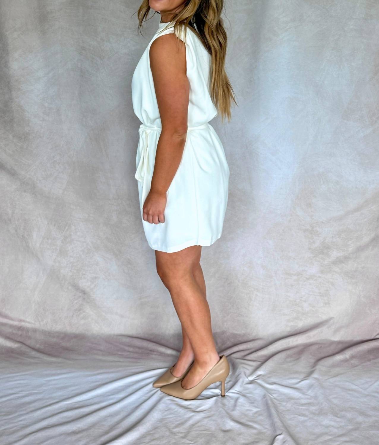 A short and breezy dress for those warmer days. Elevate your vacation wardrobe with the Padded Shoulder Tie Dress by TCEC in crisp white. This minimalist A-line mini dress features a fashionable crewneck and padded shoulders, adding a chic edge to your spring style. Crafted from 100% polyester, it includes a belt and a back buttoned keyhole closure for a flattering fit. Designed without pockets and with a solid pattern, this sleeveless dress ensures true-to-size comfort for any occasion.