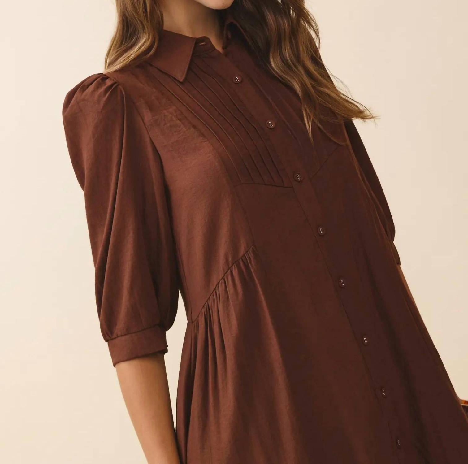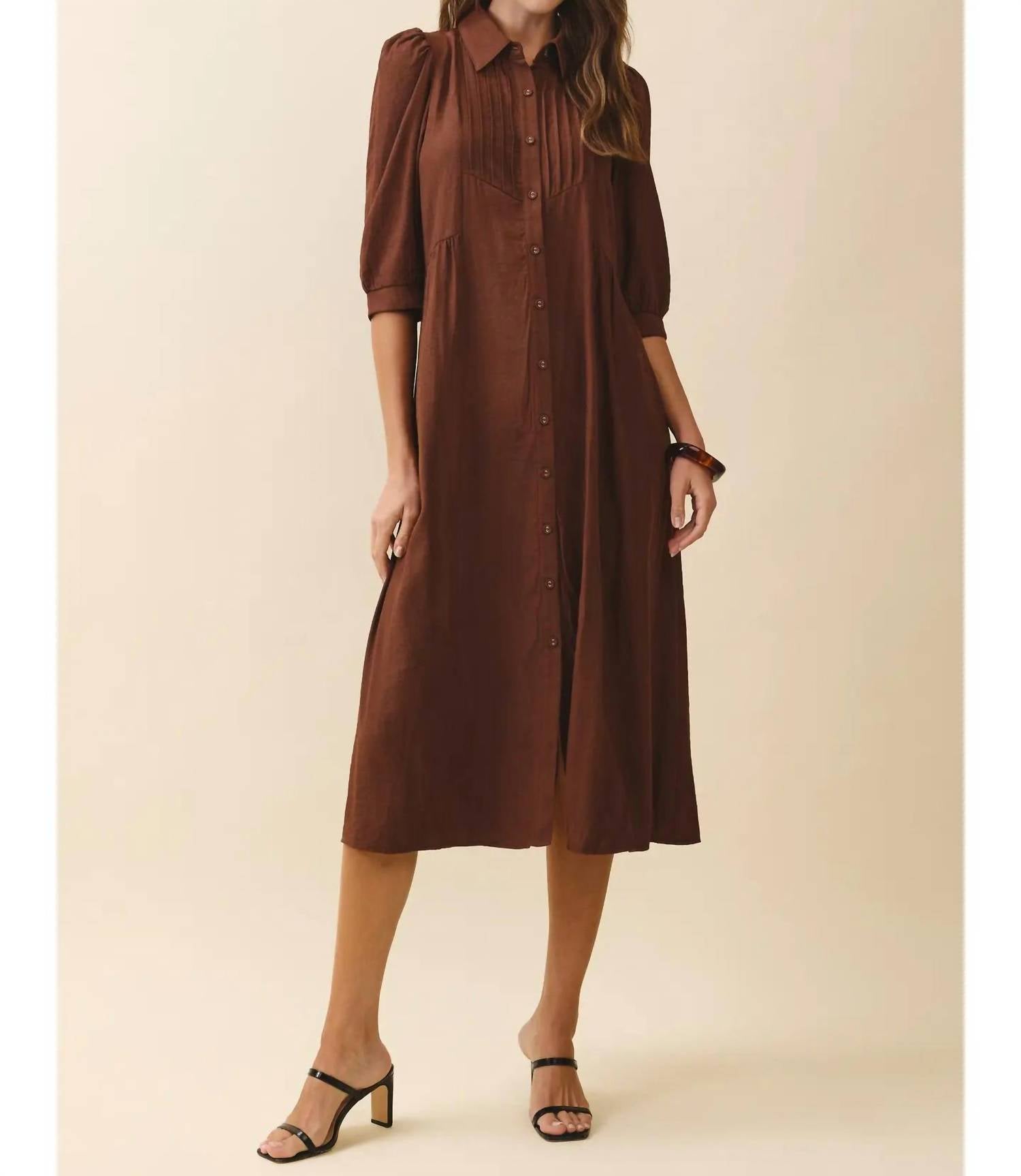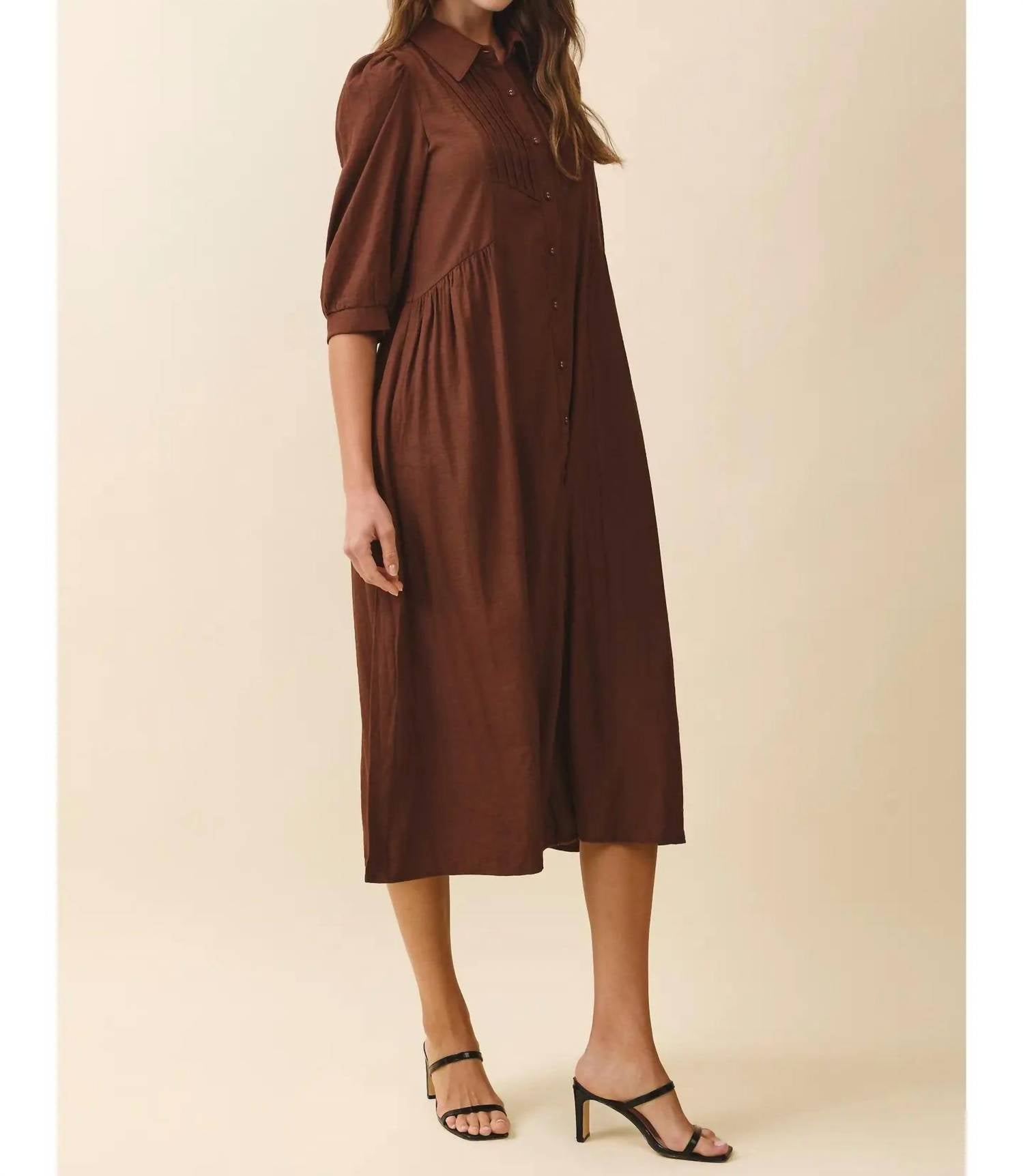 Just add slides or mules and you are good to go. Elevate your summer style with the TCEC Pintuck Midi Dress in warm brown, perfect for a minimalist, dinner party look. This dress boasts three-quarter length puff sleeves and a collared neckline, complemented by pintuck detailing along the bodice. With a relaxed fit through the waist and a gathered, flowy skirt at midi length, this piece promises comfort without compromising on style. Closure: Button closure. Model is wearing a size small (5'11" height, 31.5" bust, 23.5" waist, 35" hips).