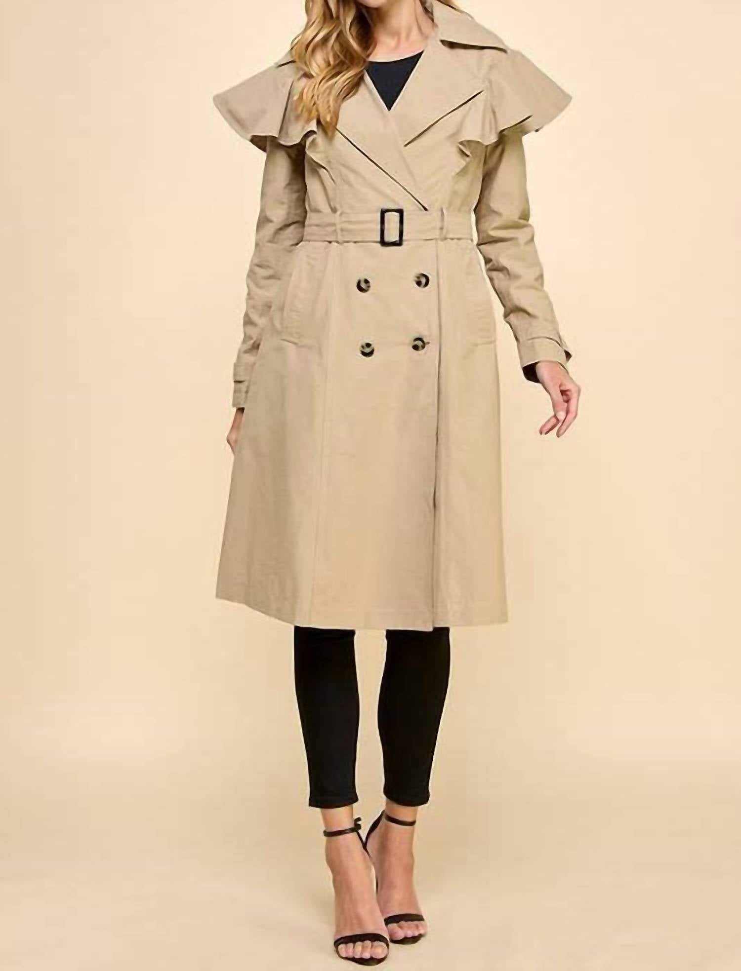 A timeless classic. You'll be reaching for this trench every season. Upgrade your winter wardrobe with the Ruffle Detail Trench Coat by TCEC, a chic piece in elegant beige. This long sleeve coat is accented with unique ruffle details on the sleeves and features a button closure and a detachable waist tie for versatile styling. Crafted from 70% cotton and 30% nylon, this trench coat is made in China and designed for a solid yet luxurious look. Care for this statement piece by dry cleaning only; model is wearing a size small (5'9" height, 33" bust, 25" waist, 34" hips).