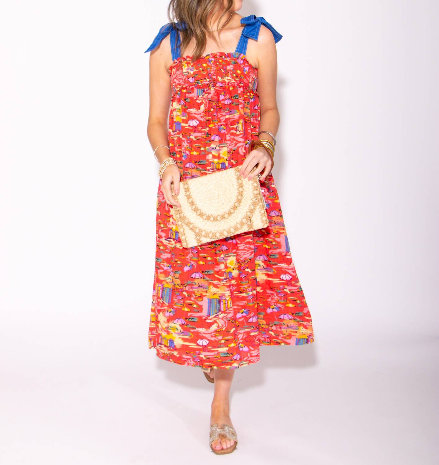 Pair with your favorite sandals for an effortlessly chic look. Introducing the Women's Summer Canvas Tie Straps Midi Dress by TCEC, a vibrant choice in a multi-colored abstract print. This sleeveless, patterned dress features a flattering smocked bodice and adjustable tie straps for customizable comfort. Crafted from canvas material with a squareneck and an elegant flare hem, it’s perfect for a summer getaway. Closure: Tie closure, adding a boho chic touch to your casual wardrobe.