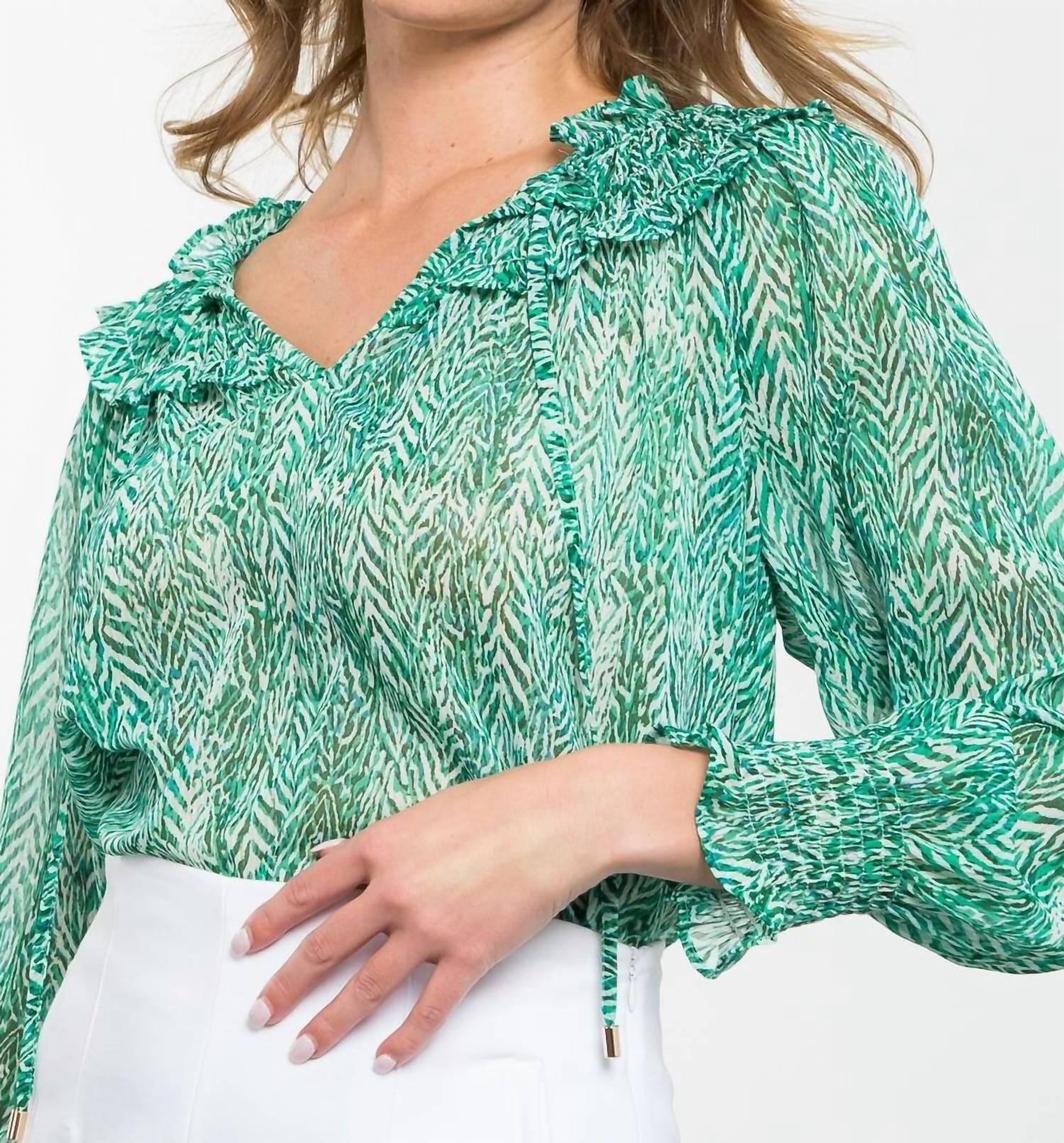 A versatile blouse that works from desk to dinner! Embrace the wild side with the Sheer Animal Print Blouse by THML, perfect for a vacation escape. This fluid cut blouse features long sleeves complete with honeycomb cuffs and a charming ruffled round neck adorned with a drawstring tie. Crafted from 100% polyester, it offers a patterned design in a striking green hue. Closure: Pull on. Care: Machine wash. Ideal for the maximalist trend this spring.