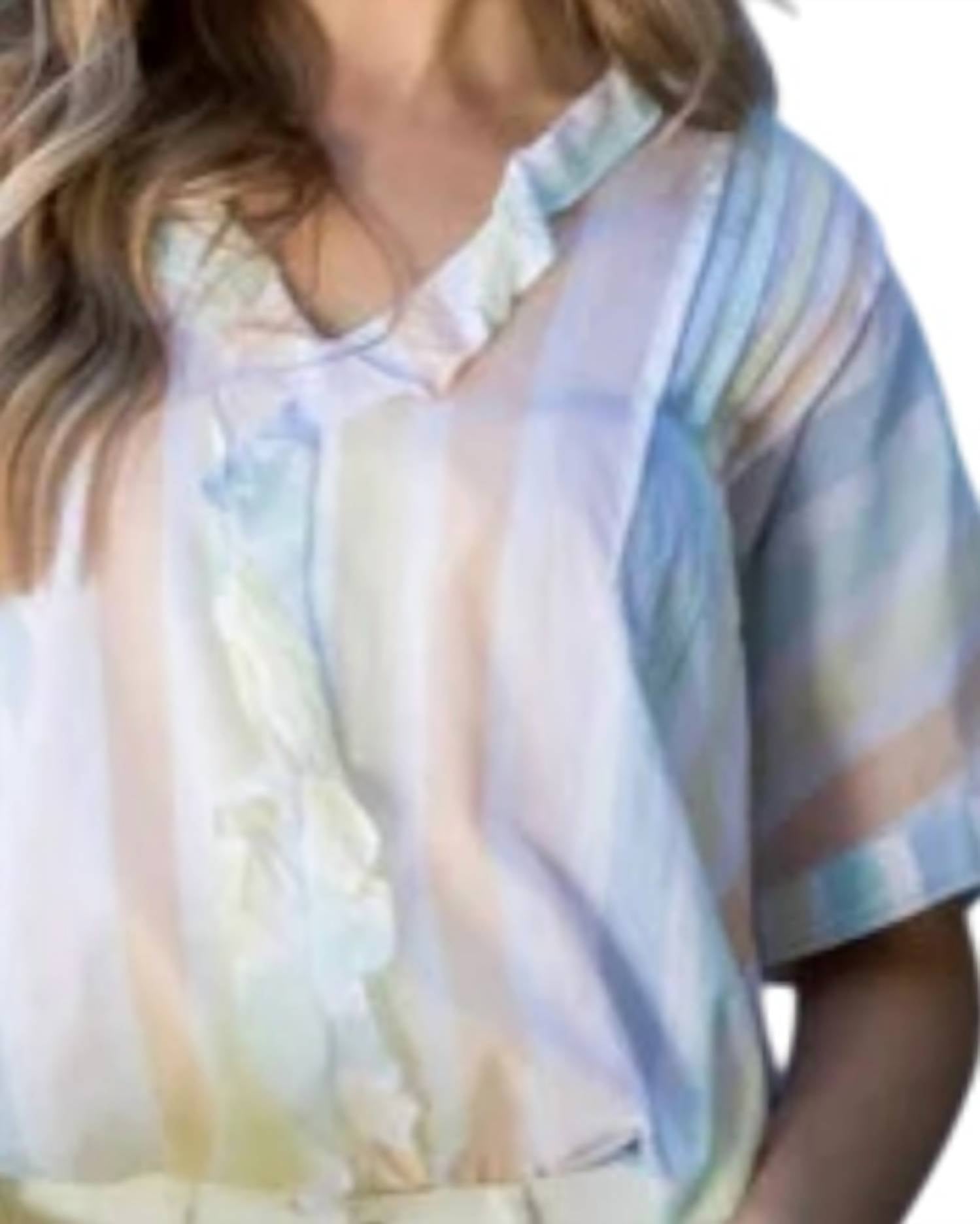 A timeless blouse that will never go out of style. The Stripe Ruffle V-neck Top by THML is a perfect blend of comfort and style, designed to elevate your wardrobe throughout the warm weather months. This multicolor short sleeve blouse is crafted from 100% lightweight cotton, ensuring breathability and ease. Embrace the timeless stripe pattern in a versatile piece that's ideal for spring, whether you're attending a dinner party or celebrating Thanksgiving. Model is wearing size small (5'9" height, 32" bust, 25.5" waist, 36" hips).