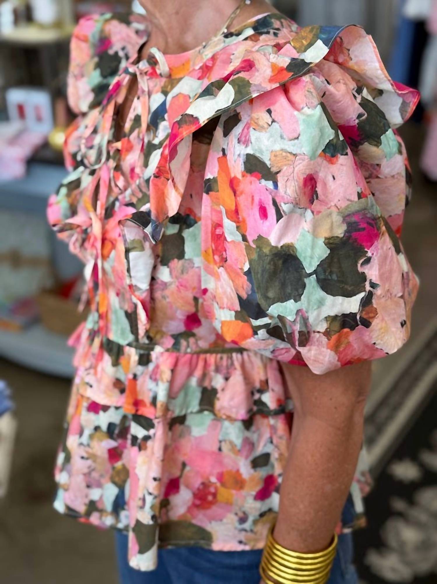 Pair this with your favorite jeans and slides for your next girls night out. Elevate your spring wardrobe with the THML Cora Ruffles Top in charming pink, embodying a playful floral pattern perfect for sunny adventures. This women's blouse features short sleeves and a crewneck, with a tie closure for a customizable fit. Made from 100% cotton, it ensures a light, breezy feel while aligning with the boho chic trend. Care: Machine wash for easy maintenance. Perfect for holiday parties or special occasions like Mother's Day. Model is wearing a medium. If in-between sizes, consider sizing up.