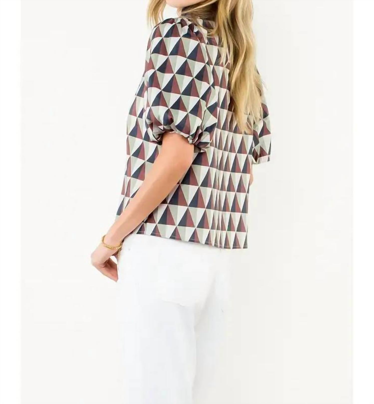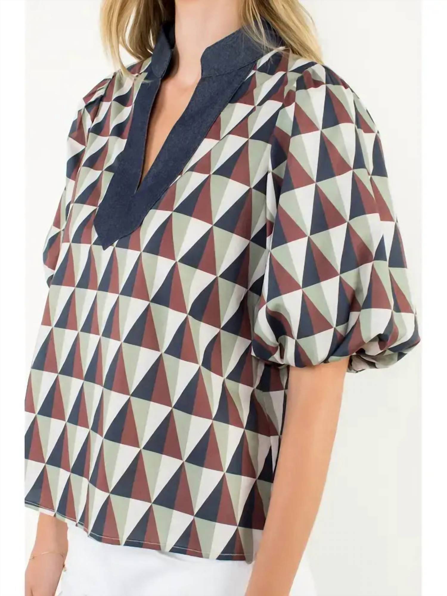 A versatile blouse that works from desk to dinner! The Lacey Geometric Top by THML is a statement piece in a mix of navy, olive, and brown with a bold geometric pattern. Its short puff sleeves and V-neckline create a flattering silhouette, accented by a unique denim trim. Made from cotton, it offers a comfortable and breathable wear ideal for spring occasions like Thanksgiving housewarmings. Designed for easy styling, this pull-on blouse is machine washable for your convenience.