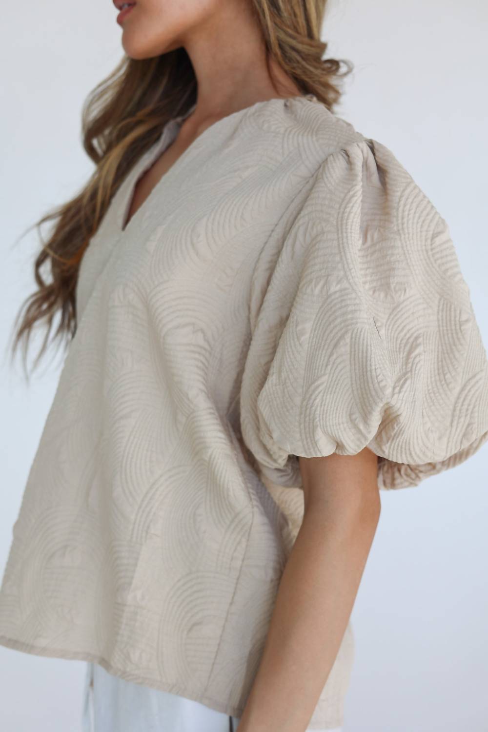 A timeless blouse that will never go out of style. Elevate your wardrobe with the THML Lisa V-neck Top, crafted in a stunning beige textured fabric ideal for any occasion. This women's blouse features short puff sleeves for a fashionable flair. Made from 100% Polyester, the top offers a comfortable pull-on closure. To maintain its condition, hand wash and line dry this patterned piece.