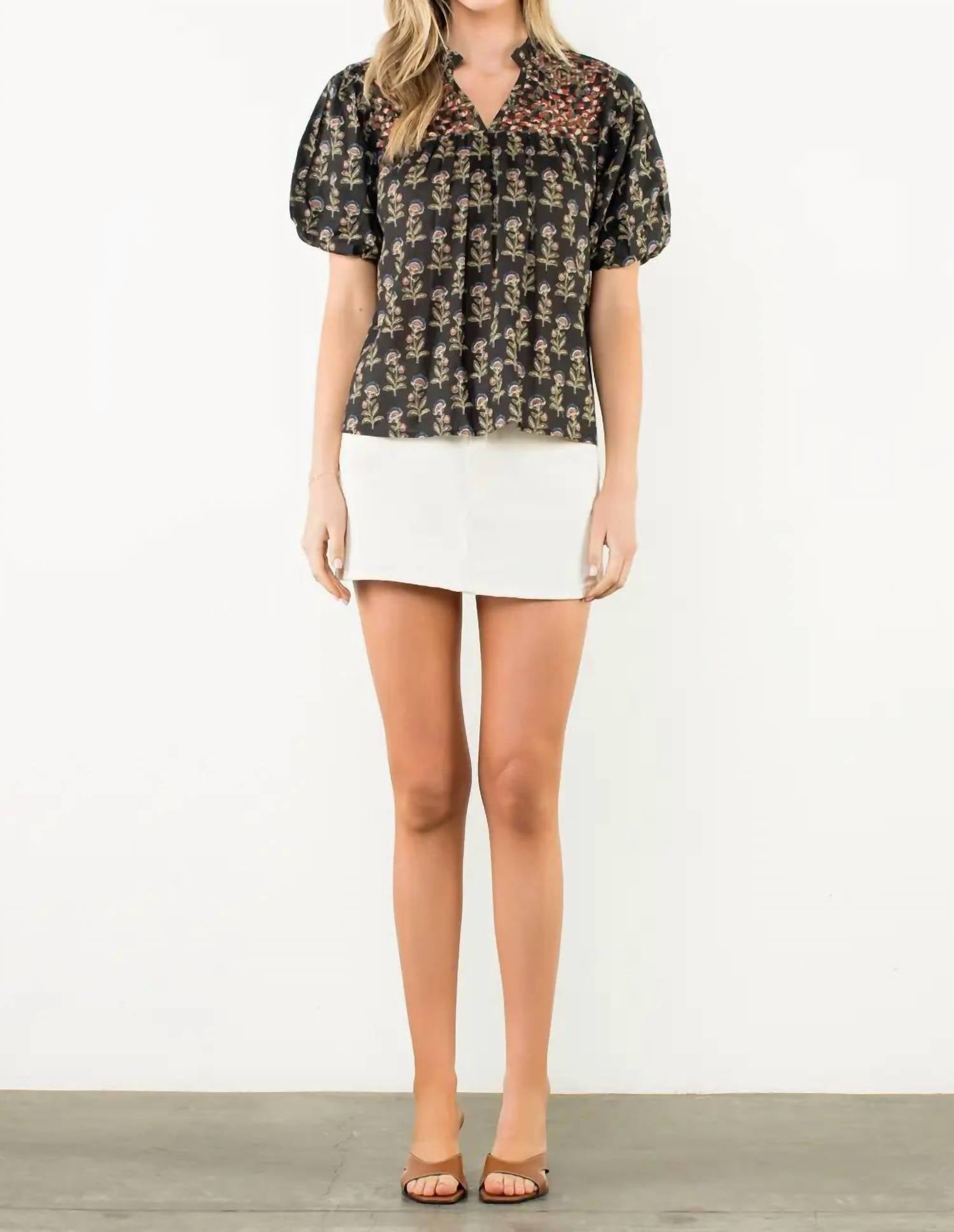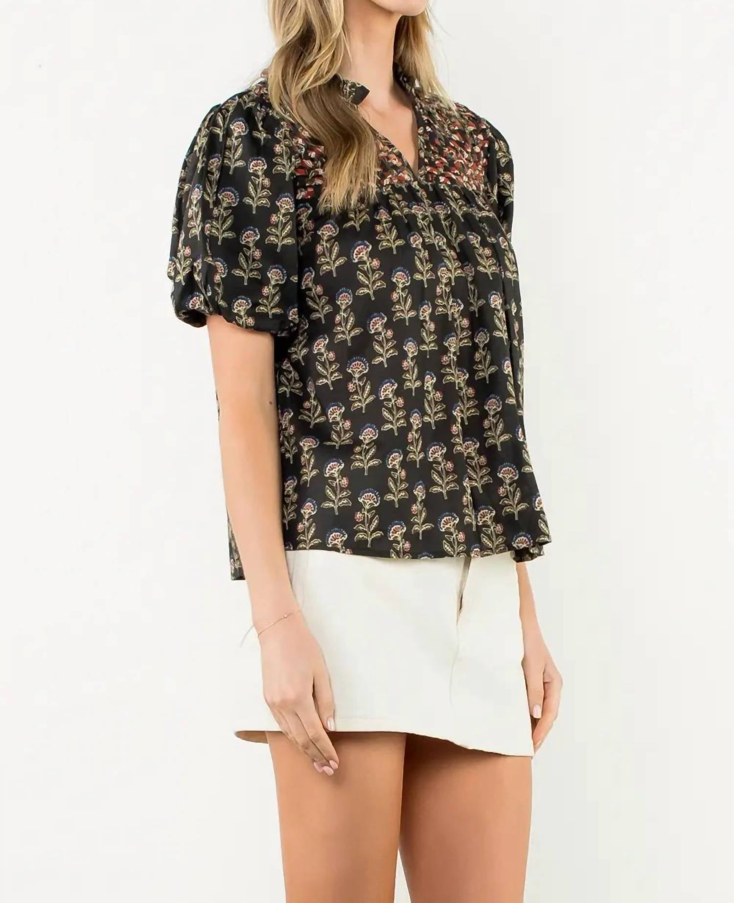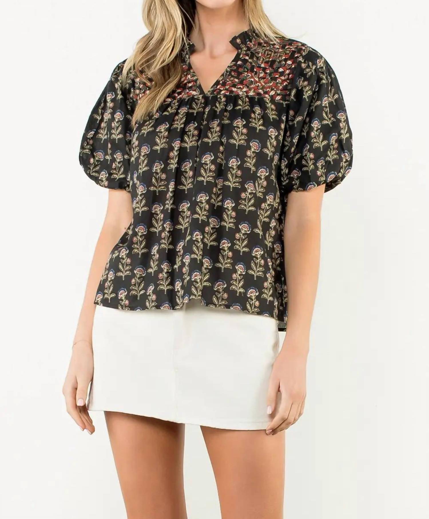 Pair this with your favorite jeans and slides for your next girls night out. Discover the Lori Floral V Neck Top by THML, a chic addition to your spring wardrobe, perfect for a holiday party or Thanksgiving celebration. This women's blouse in elegant black features short puff sleeves and a flattering v-neckline. Closure type is pull-on for easy wear. Care for this floral-patterned garment with machine wash instructions.