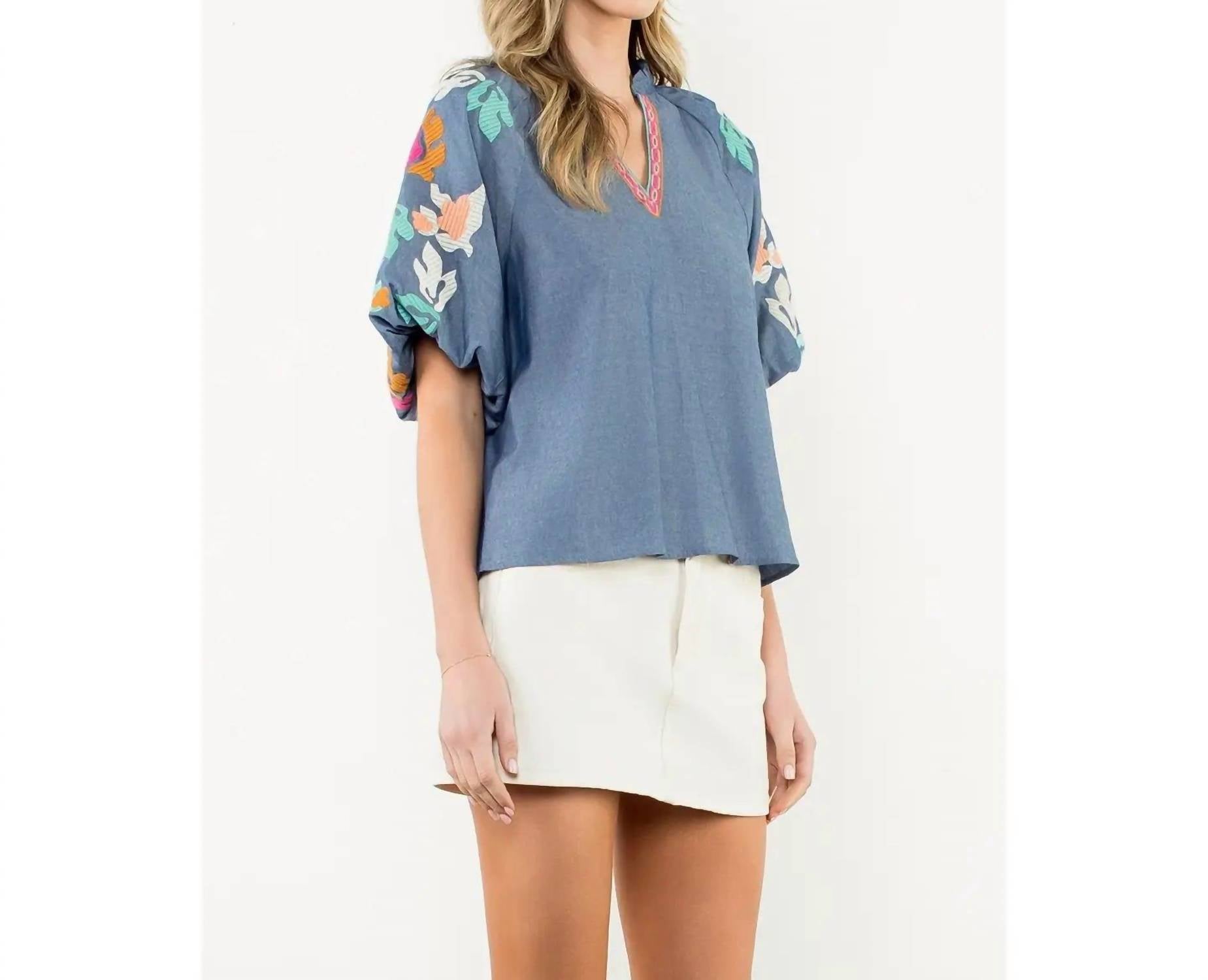 A timeless blouse that will never go out of style. Embrace the essence of spring with the Mia Embroidered V Neck Top by THML, a perfect choice for your vacation wardrobe. This blue blouse features charming embroidered patterns and short puff sleeves, exuding an effortlessly stylish appeal. Designed with a convenient pull-on closure, it combines ease and elegance, ideal for warm weather outings.