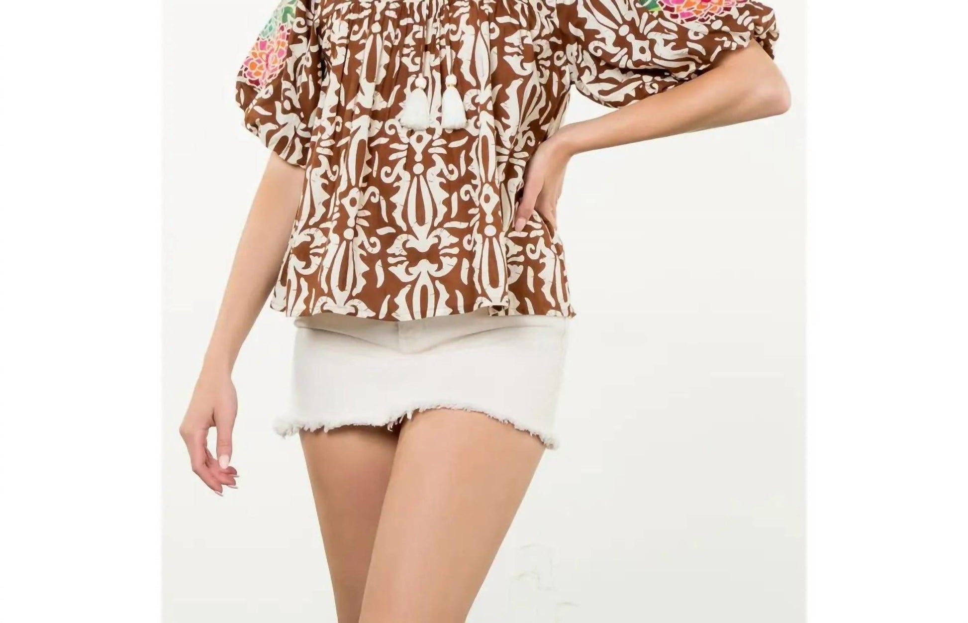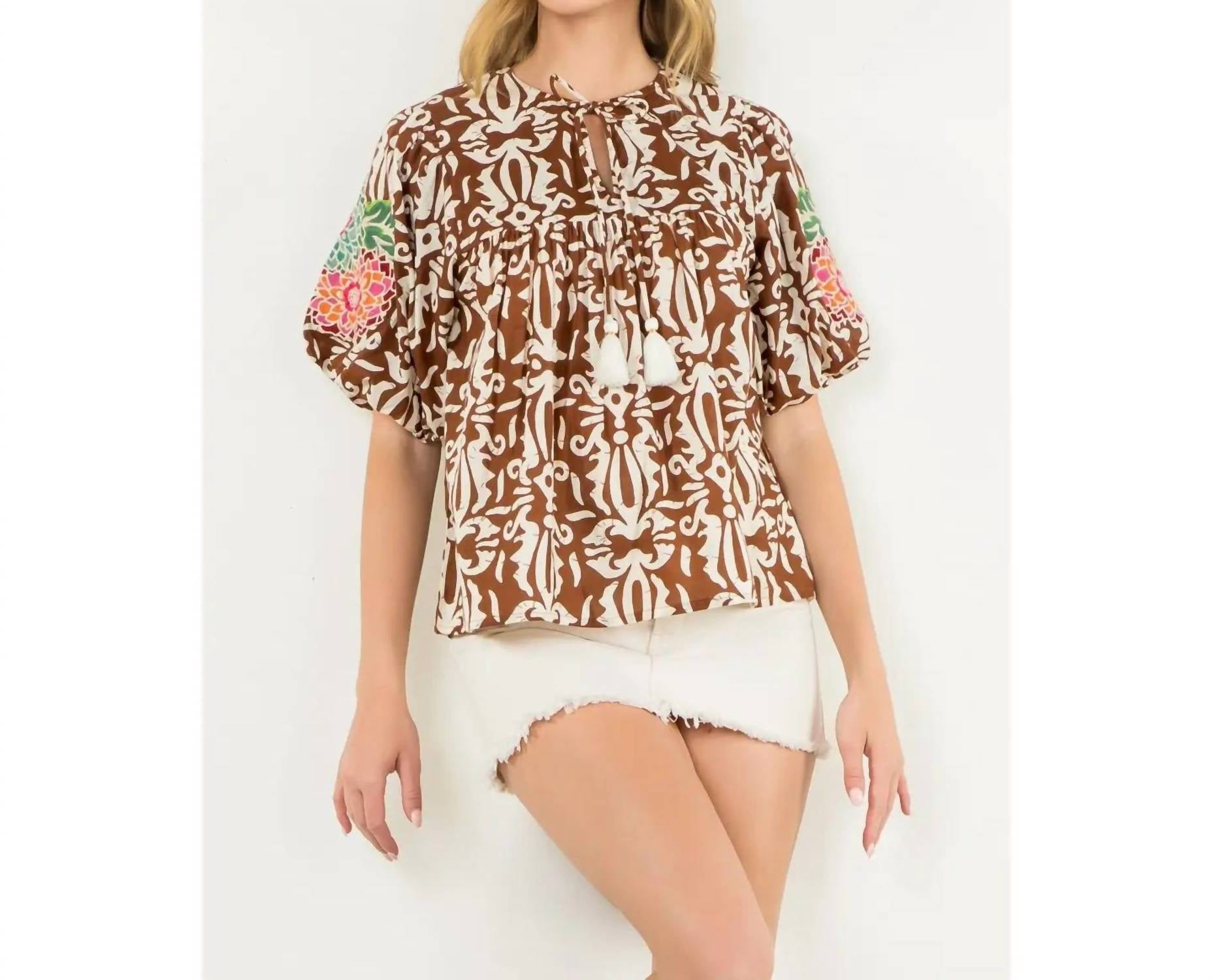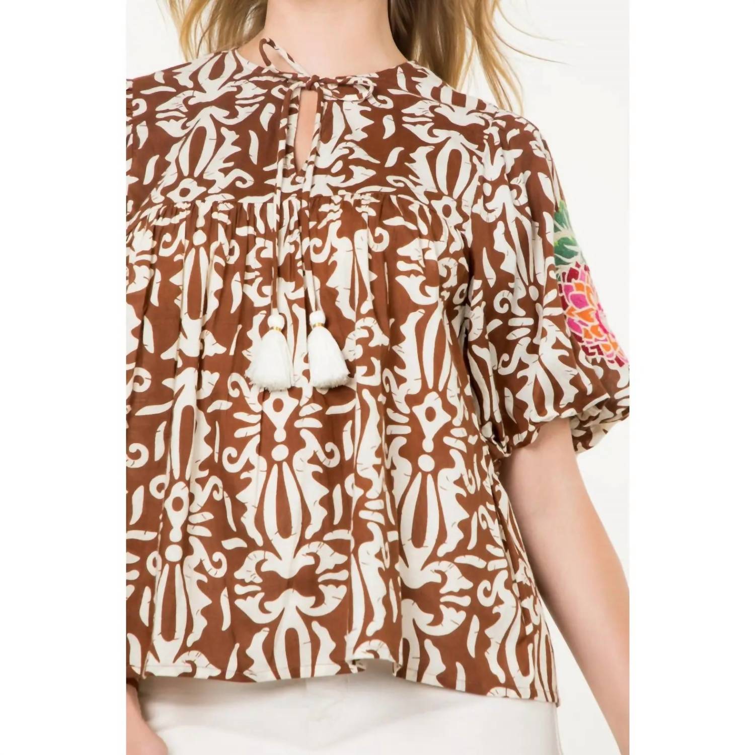 A timeless blouse that will never go out of style. Discover the Penny Print Tassel Top by THML, a perfect addition to your spring wardrobe with its boho chic appeal. This patterned blouse features short puff embroidered sleeves and a charming tassel tie. The pull-on style boasts a crewneck for easy wearability.