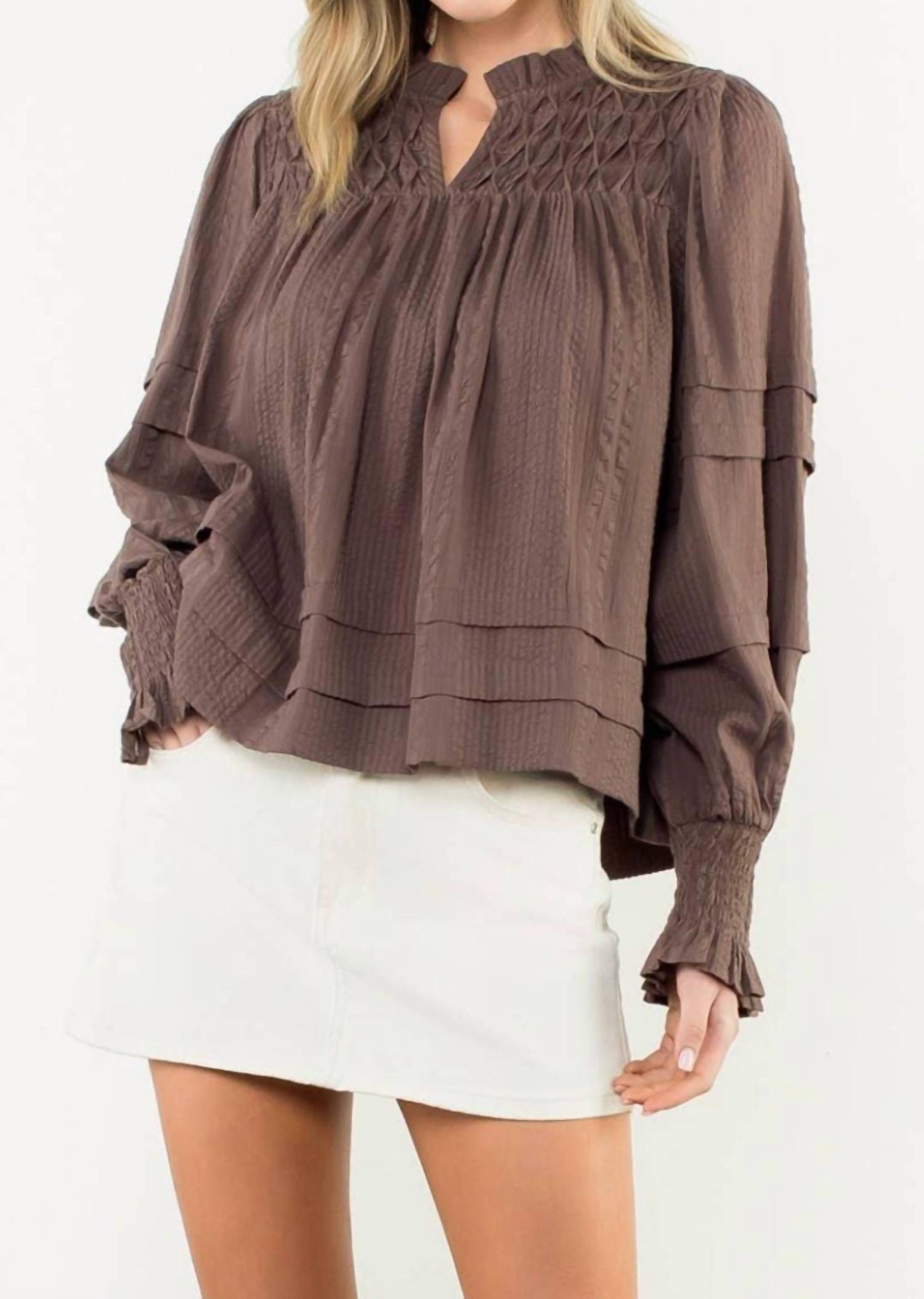 A timeless blouse that will never go out of style. Elevate your spring wardrobe with the Smocked Cuff Textured Long Sleeve Blouse by THML, an ideal choice for a holiday party. This women's blouse features a long sleeve design with a smocked cuff, crafted entirely from 100% cotton for ultimate comfort. The pull-on closure and V-neckline add to its minimalist charm, ensuring easy wear and elegant style.