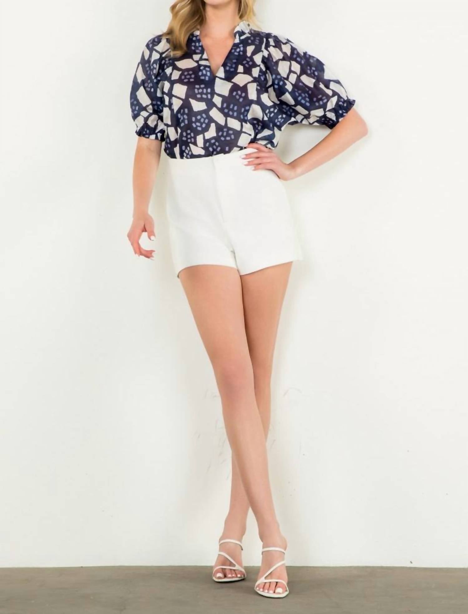 A versatile blouse that works from desk to dinner! The Stepping Stone Top by THML is a chic semi-sheer blouse in navy, perfect for a dinner party. It features short puff sleeves and a stylish all-over pattern. Crafted from a nylon blend with 75% Tencel, 20% Nylon, and 5% Linen, it's designed for a minimalist spring look. With a convenient pull-on closure and a classic collar, this is a must-have for any fashion-forward wardrobe.