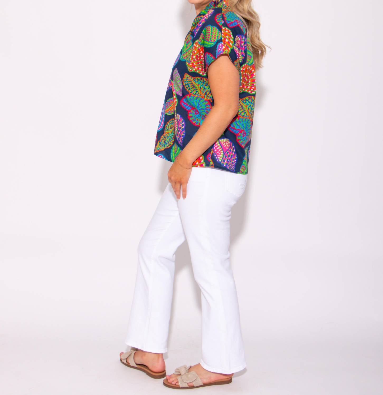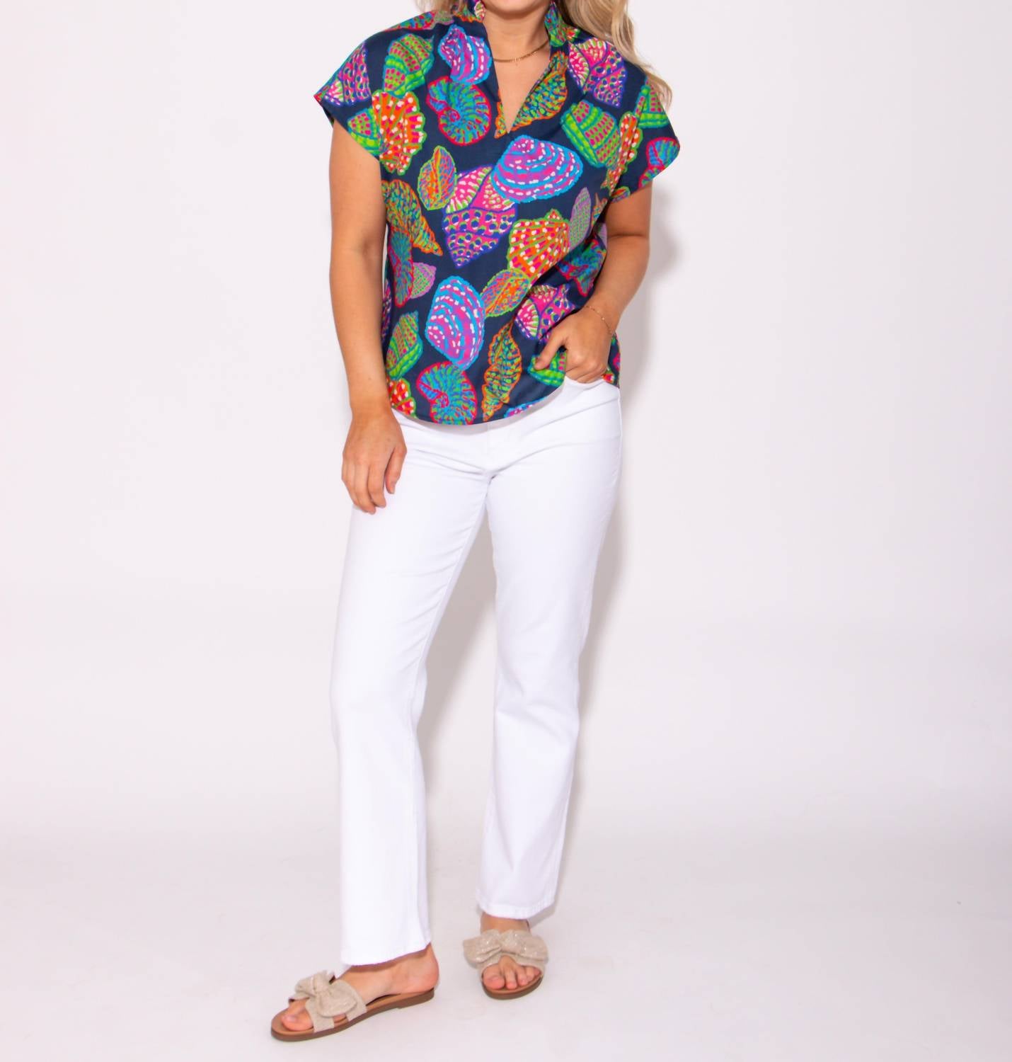 Pair this with your favorite jeans and slides for your next girls night out. Embrace seaside allure with the Women's Coastal Charm Split Ruffle High Neck Top by THML, bringing vibrant marine vibes to your style. This Navy blouse features short sleeves and a pull-on closure, capturing breezy elegance in its design. Ideal for spring, its playful animal pattern enhances the collar neckline for a boho chic look. Perfect for vacations or casual evenings, this piece offers a splash of coastal charm to elevate your wardrobe.