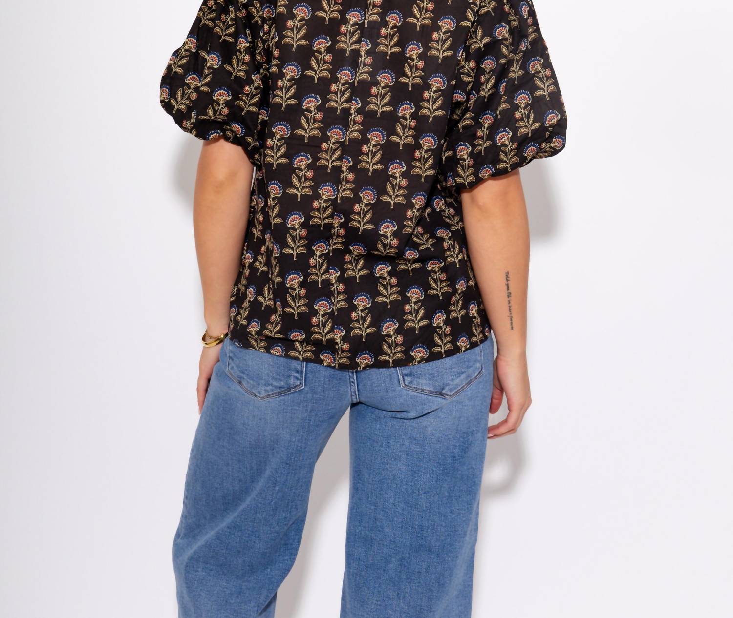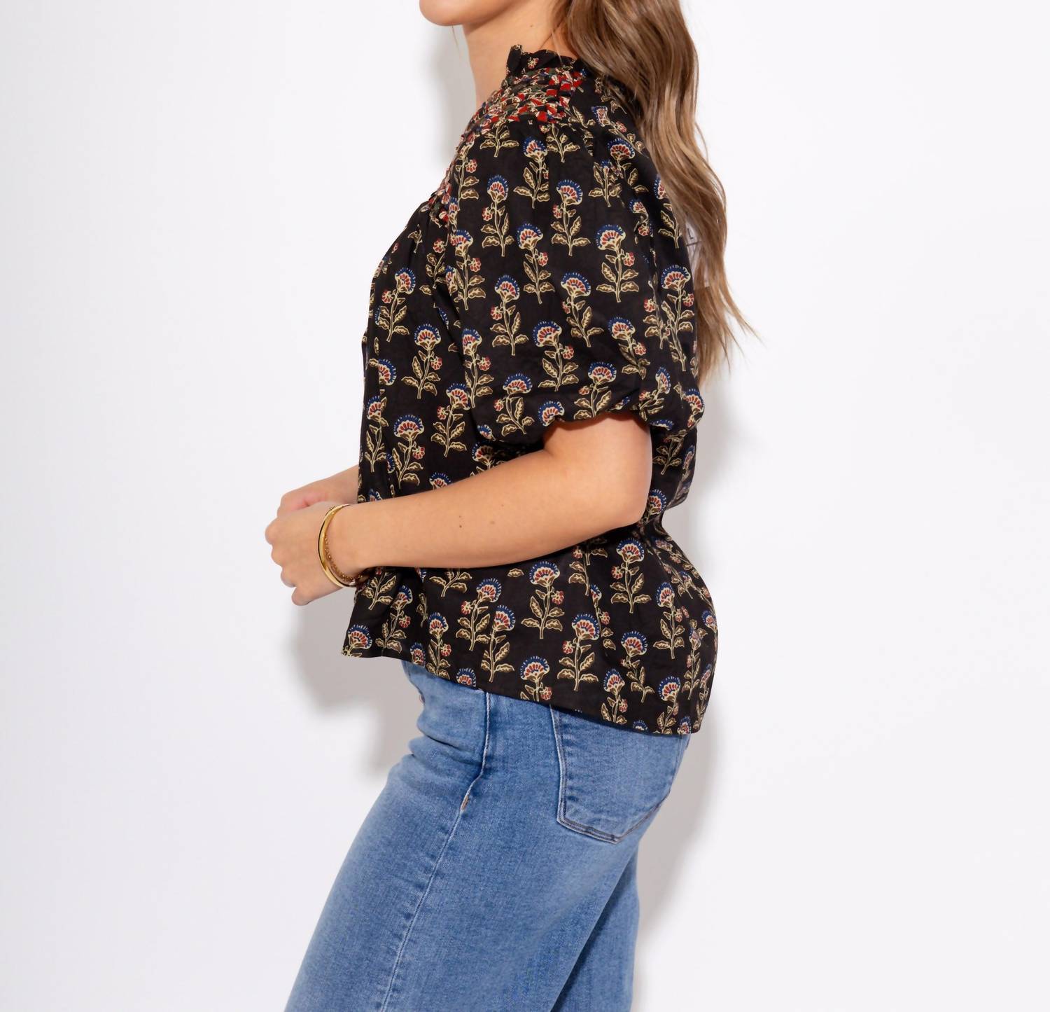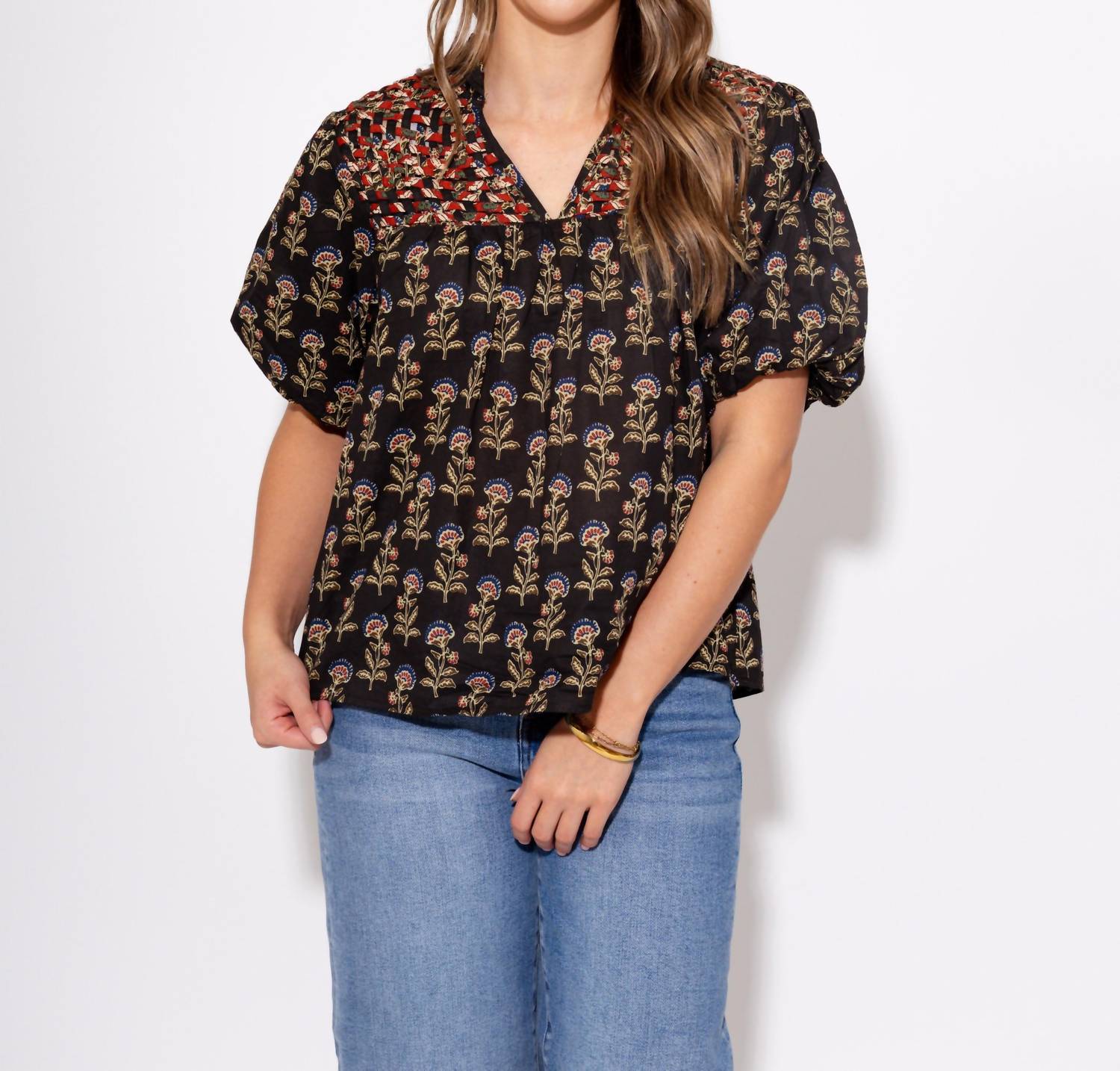 A timeless blouse that will never go out of style. Infuse your wardrobe with the Boho Chic elegance of the Woven Detail Floral Puff Sleeve Top by THML. This black blouse flaunts short puff sleeves and a textured woven panel across the chest in vibrant shades of red, blue, cream, and olive. Designed with a convenient pull-on closure and a flattering V-neckline, it’s a versatile choice for any holiday party occasion. To maintain its charm, hand wash and line dry as needed.
