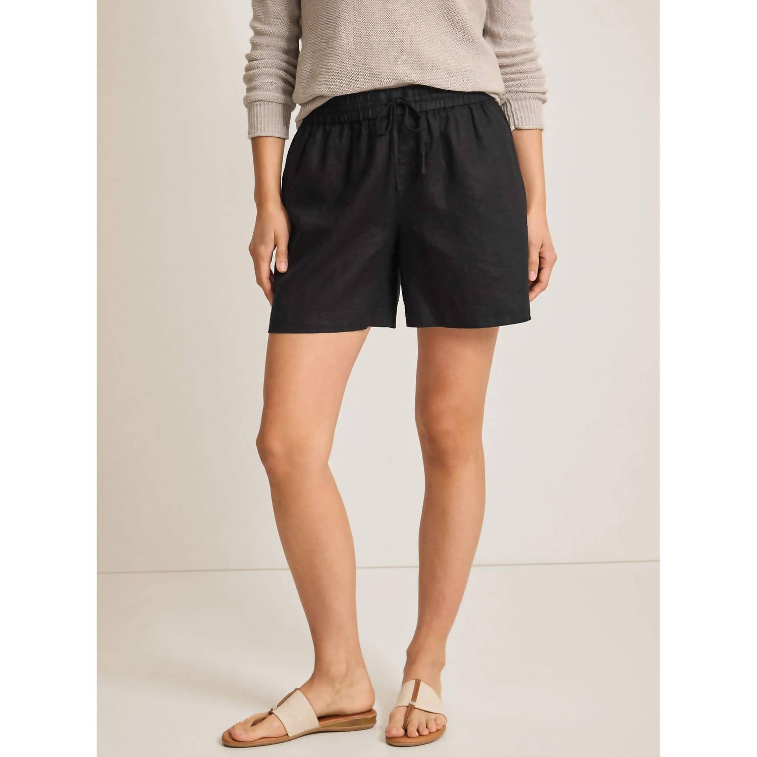Tuck your favorite tee into these high-waist shorts for a more casual-cool feel. Introducing the Two Palms Easy Shorts by Tommy Bahama, a must-have for your summer vacation wardrobe. These high-waisted women's shorts are crafted from 100% linen in a solid black pattern. Designed with a 5-inch inseam, they feature a convenient pull-on closure and practical pockets. Care for these minimalist shorts by machine washing and line drying.