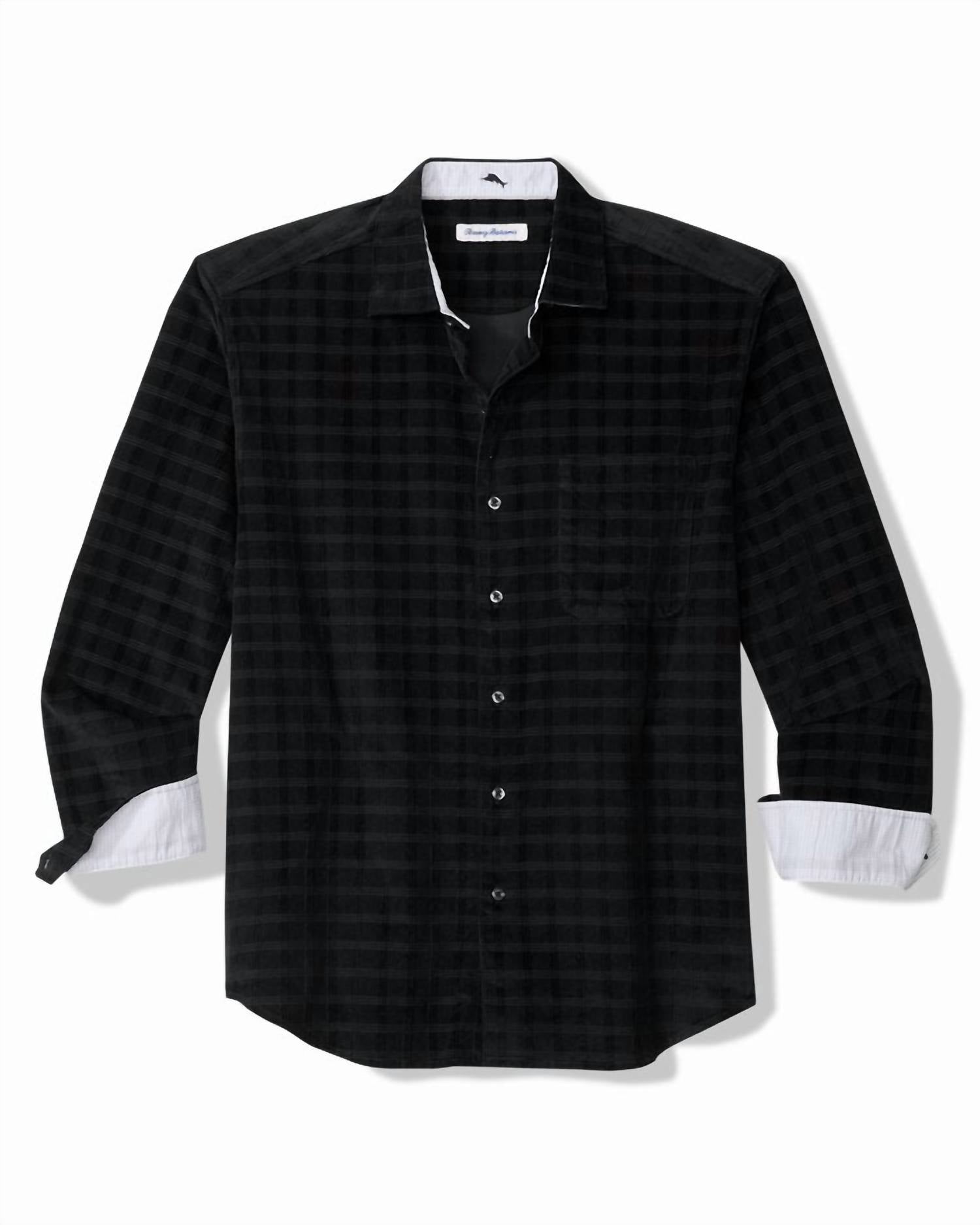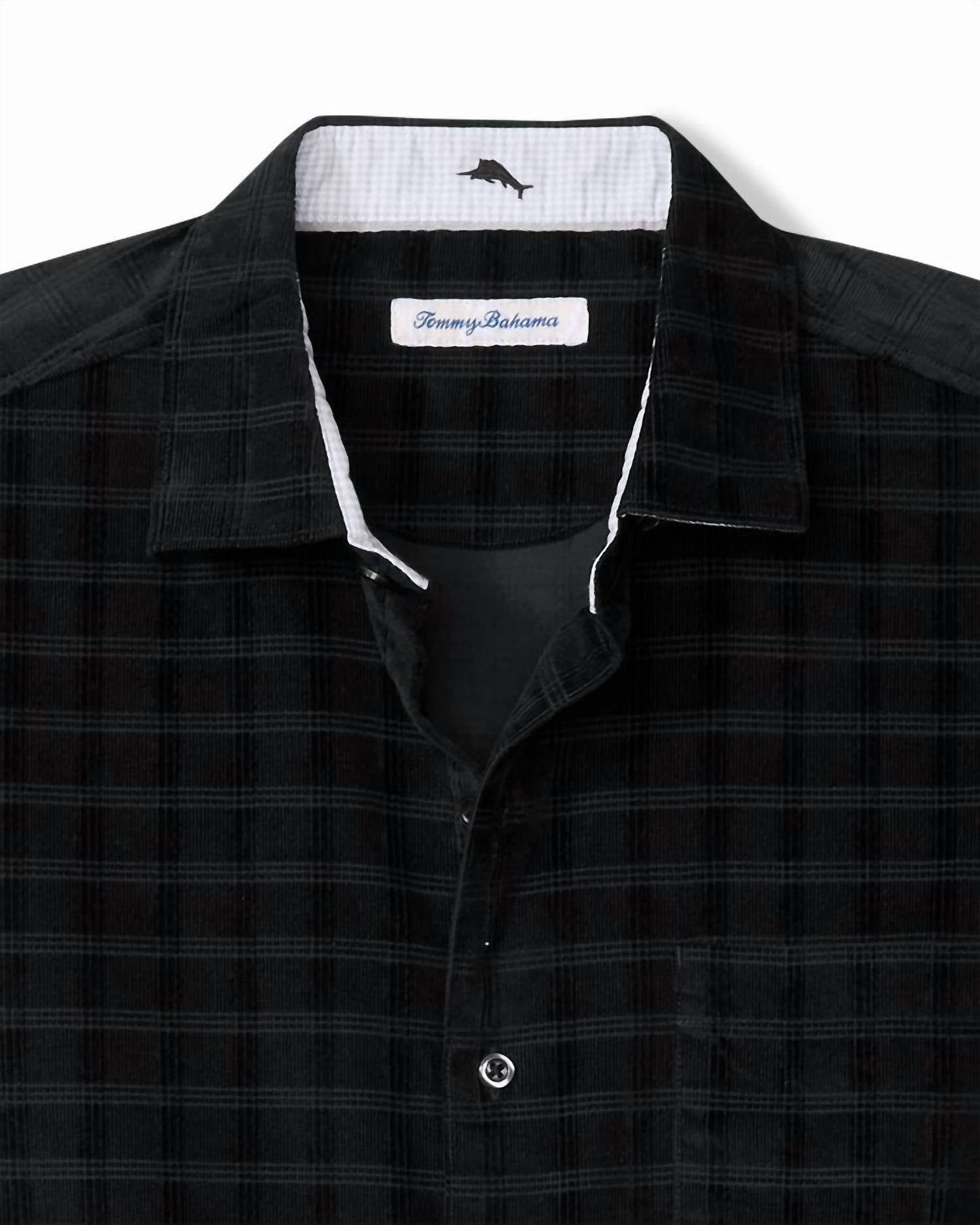 Embrace timeless sophistication with the Check Island Long Sleeve Corduroy Shirt by Tommy Bahama in a classic Black plaid & check pattern. Crafted from 100% cotton, this versatile shirt features long sleeves, a two-piece stand collar, and a chest pocket, all enhanced by a chic button closure. It boasts a distinctive shirttail hem with side seam gussets and contrast woven print detailing inside the collar and cuffs. Designed for easy care, it can be machine washed cold with like colors and tumble dried on low.