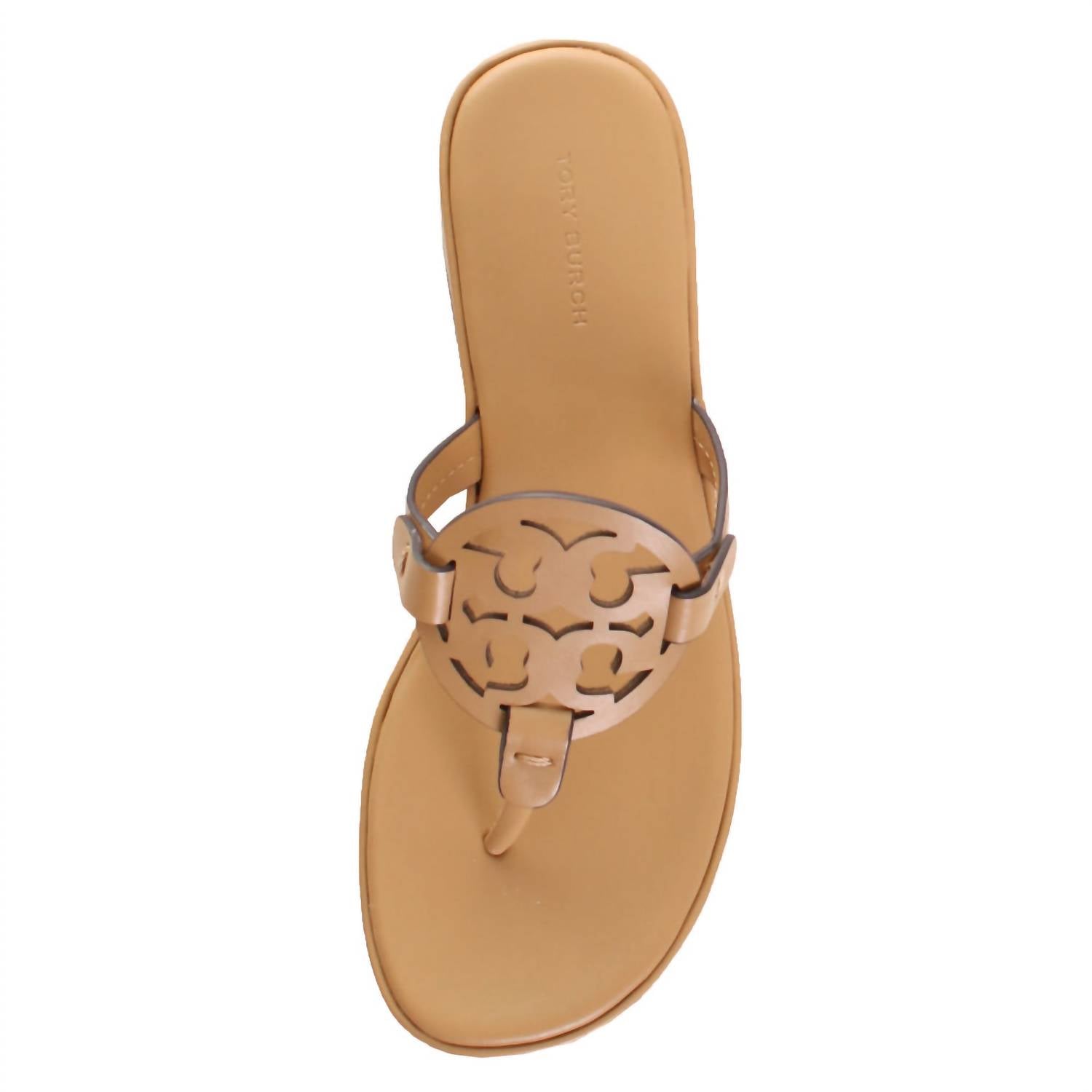 This sandal will take you from brunch to dinner and everything in between. Step into summer with the Women's Miller Wedge Sandal by Tory Burch, an essential for every stylish wardrobe. Made of a Napa leather upper with a CMEVA sole, this chic Ginger Shortbread sandal features a sophisticated open toe design and a comfortable thong platform. Designed for effortless elegance, it includes a 1.06" (27mm) heel and a 1.34" (34mm) platform to elevate your look. Perfect for holiday parties and streetwear trends, these sandals are imported and come in a box.