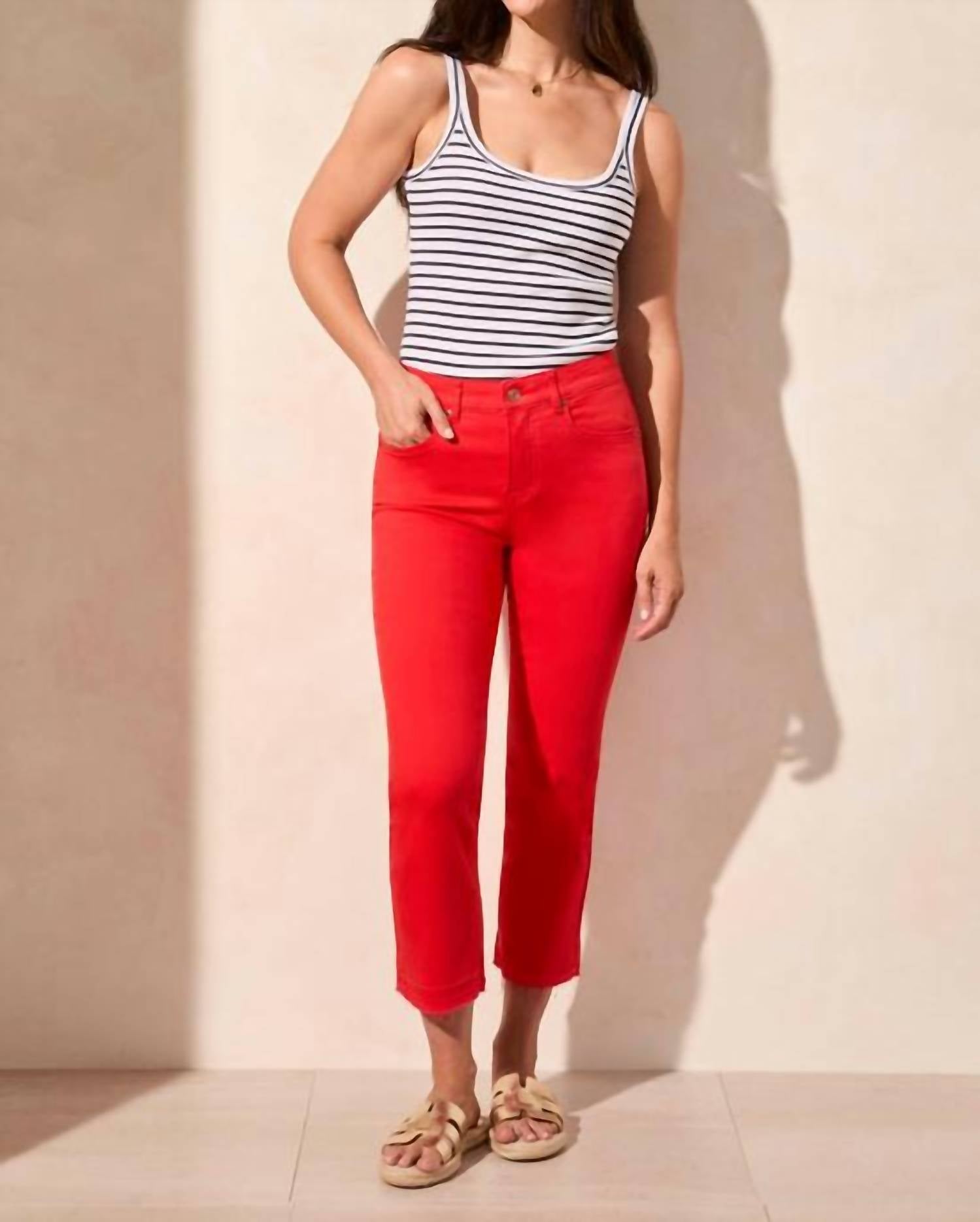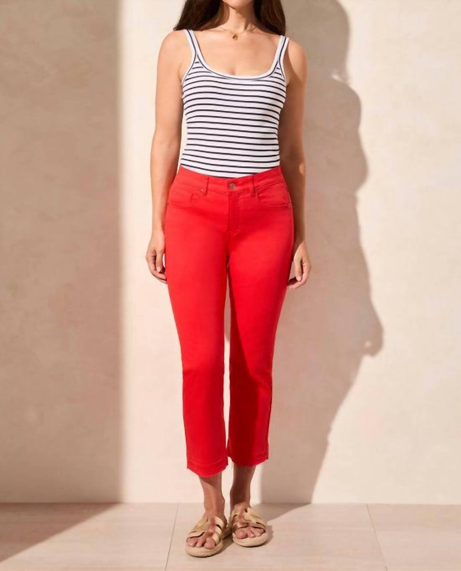 A flattering silhouette that's suprisingly versatile. Introducing the Sophia Curvy 25 Inch With Released Hem Flared Jeans by TRIBAL, designed with a flattering curvy fit and a comfortable 25'' inseam. These mid-rise jeans, featuring an elastic waist with a tummy tuck band, provide a tailored look with a 10.5'' rise and functional five-pocket design. Made from a soft stretch cotton blend, the jeans showcase a stylish flared leg and a distressed hem, perfect for a casual streetwear vibe. Closure: Button and fly. Care: Wash before wear, machine wash delicate cycle cold water, separately, do not bleach, tumble dry low, low iron if needed.