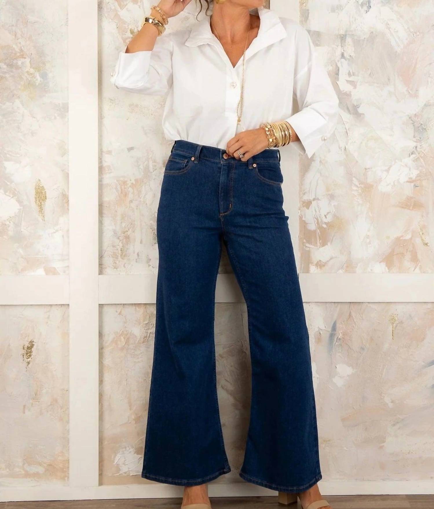 Pair these wide leg jeans with mules, slides or your favorite strappy sandals. Discover the Brooke Hugging Palazzo Jeans by TRIBAL, your go-to pair for sleek, stylish comfort. These dark denim wide-legged jeans, with a high-rise and relaxed fit, are crafted from a cotton blend composed of 93% Cotton, 6% Elastane, and 1% Lycra. Featuring a zipper closure for easy wear, they offer effortless elegance with a flattering high-rise waist and a 30" inseam. Care: Hand wash cold separately, do not bleach, and hang to dry. Model Erin wears a size 6, true to size with measurements of rise 12" and hip 16".