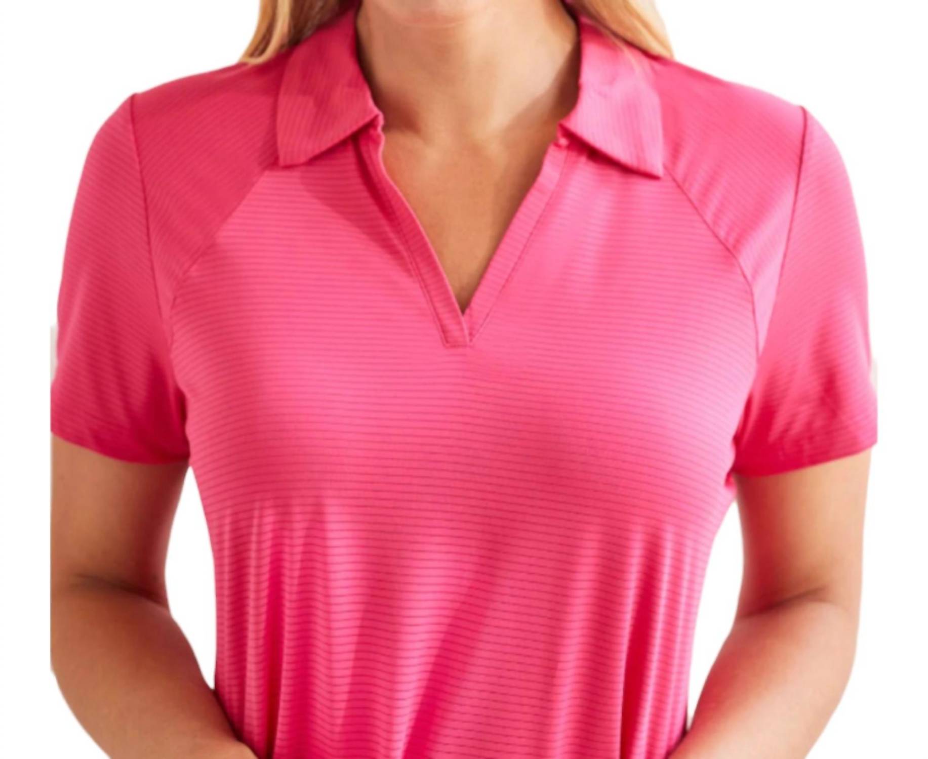 Look no further, you just found your perfect tee! Vibrant Raspberry, designed for women who love to move. Short sleeve top offers superior comfort with its 86% Polyester and 14% Spandex composition. Featuring moisture-wicking fabric and UPF 50 sun protection. Crafted with a solid pattern and a classic collar neckline. Pull-on style. Machine wash and lay flat to dry.