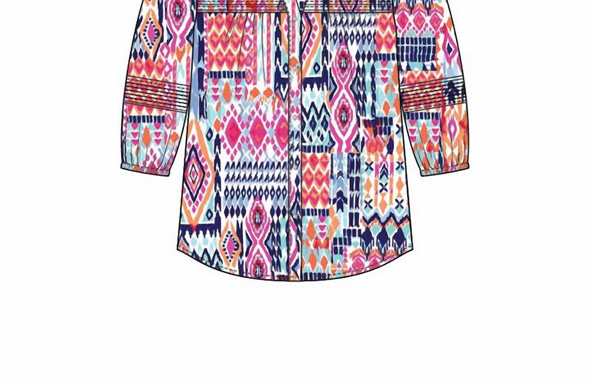 A timeless blouse that will never go out of style. Add a splash of color to your wardrobe with the Pattern Button Front Blouse by Tribal, an eye-catching option in vibrant hues of jet blue, navy, white, fuchsia, orange, and mint. Featuring a v-neckline and pleats across the chest and sleeves, this blouse showcases three-quarter balloon sleeves for added flair. Composition: 100% Rayon. Closure: Button closure. Care: Hand wash cold water. True to size (Ali is in the medium).
