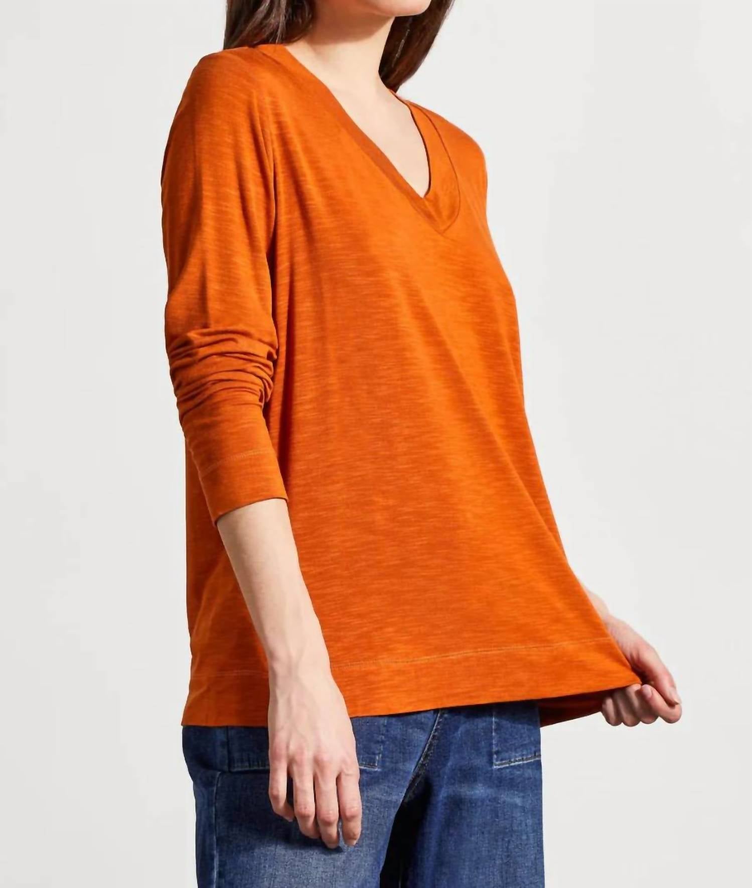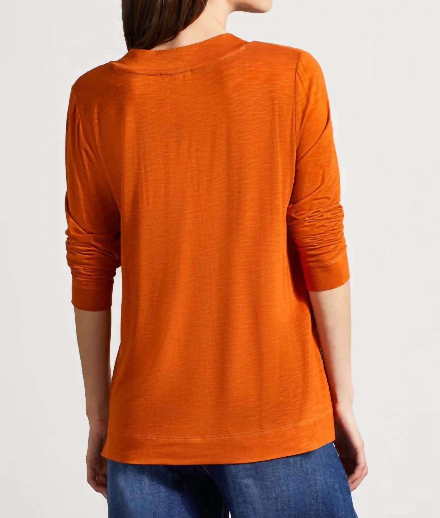 A long sleeve top you can wear with denim, skirts, well... just about anything! Effortless style into your wardrobe. Crafted from stretchy slub jersey fabric. Features long sleeves with cuffs and a chic pop-over V-neck. Wide bottom hem with side slits in the color Dark Desert adds a trendy touch to your look. Requires machine wash on a delicate cycle with like colors, line dry, and low iron if needed.