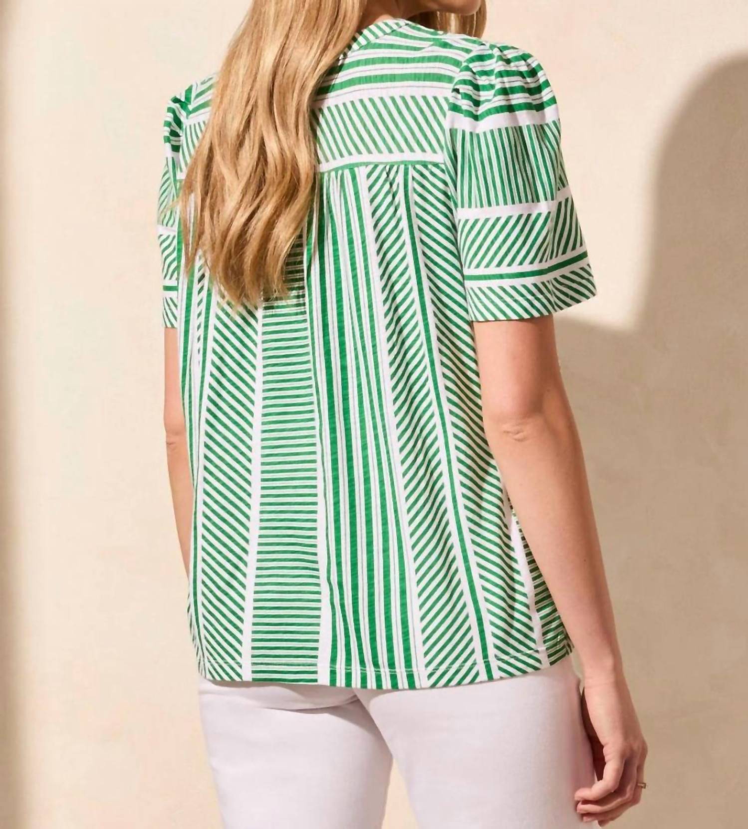 Pair this with your favorite jeans and slides for your next girls night out. Introducing the Flare Empire Waist Top by TRIBAL, a chic piece perfect for the spring season and holiday parties. This top in kelly green features a tribal/aztec design with a flattering V-neckline and button closure. Made from a comfortable cotton blend of 51% cotton and 49% rayon, the garment has a longer short sleeve for added style. Care instructions include hand washing in cold water, making it an easy addition to your wardrobe essentials.