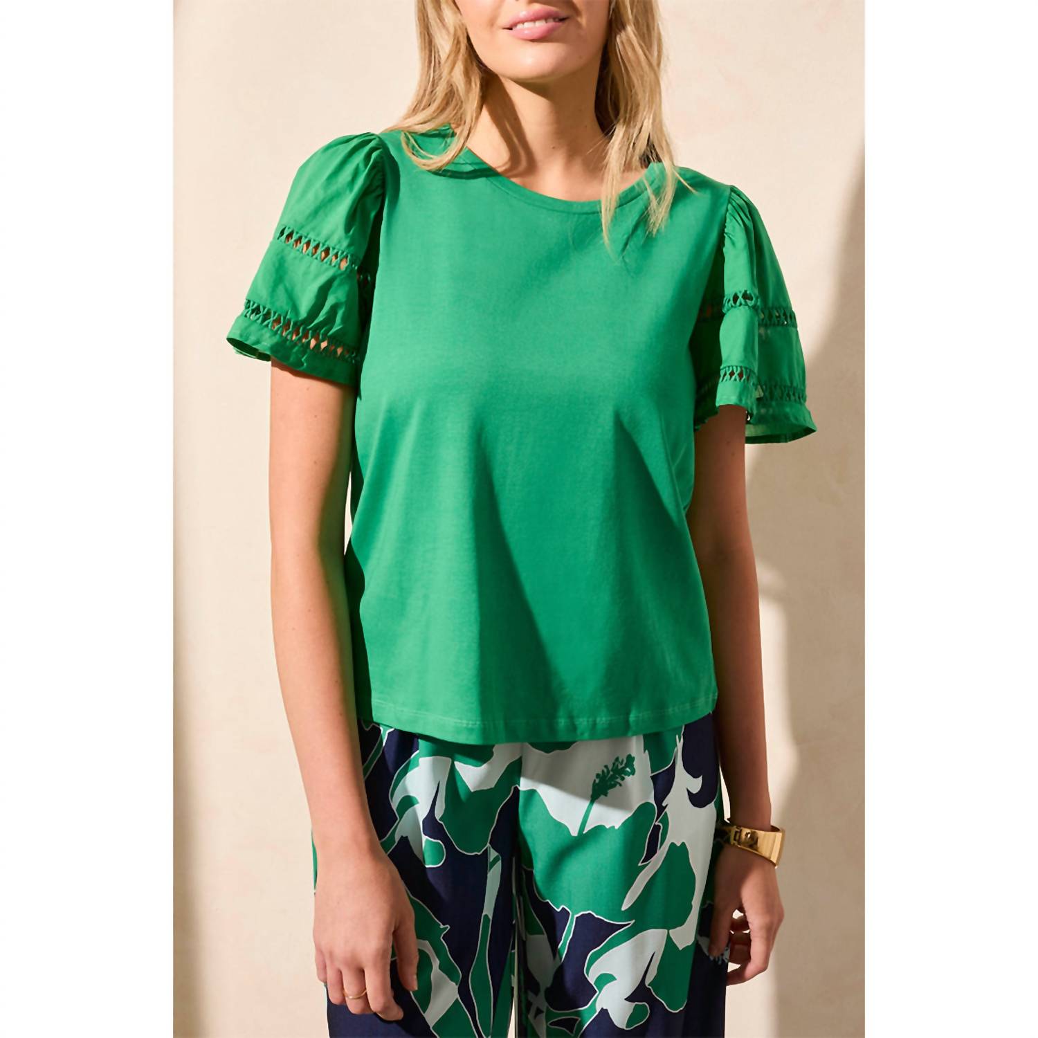 A versatile blouse that works from desk to dinner! Embrace the vibrant Kelly Green with this Flutter Short Sleeve Top by TRIBAL, perfect for any minimalist's spring wardrobe. Made from 100% cotton, this blouse features a crewneck and flutter sleeves adorned with crochet detailing for a touch of elegance. The pull-on style ensures easy wear and comfort. Care instructions: Machine wash normal.