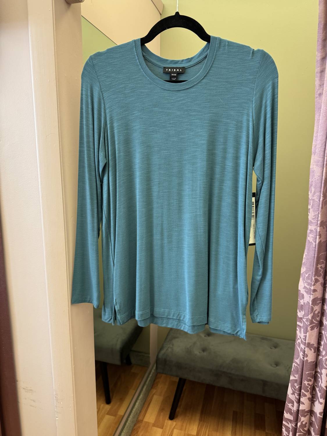 The perfect long sleeve tee that goes with just about anything. This long-sleeve slub jersey top has a relaxed fit with a scoop neckline and a back pleat detail for added shape. It is made from 95% rayon and 5% spandex.