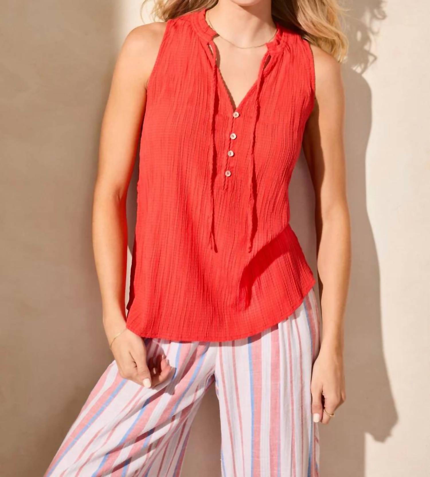Fit, fabric and functionality. This tank top checks all the boxes. Refresh your warm-weather style with this breezy sleeveless blouse, featuring a flowy fit for easy movement. A v-neckline with ruffle detail and draping tie accents adds charm, while shell buttons lend an organic touch to the adjustable front placket. Style: 2168O-8140-0670 Details V-neckline Flowy fit Sleeveless Ruffle and self tie accent at the collar Shell button at front placket Textured vertical stripe fabric Care Machine wash normal cycle cold water, with like colors, do not bleach, tumble dry low, low iron if needed.