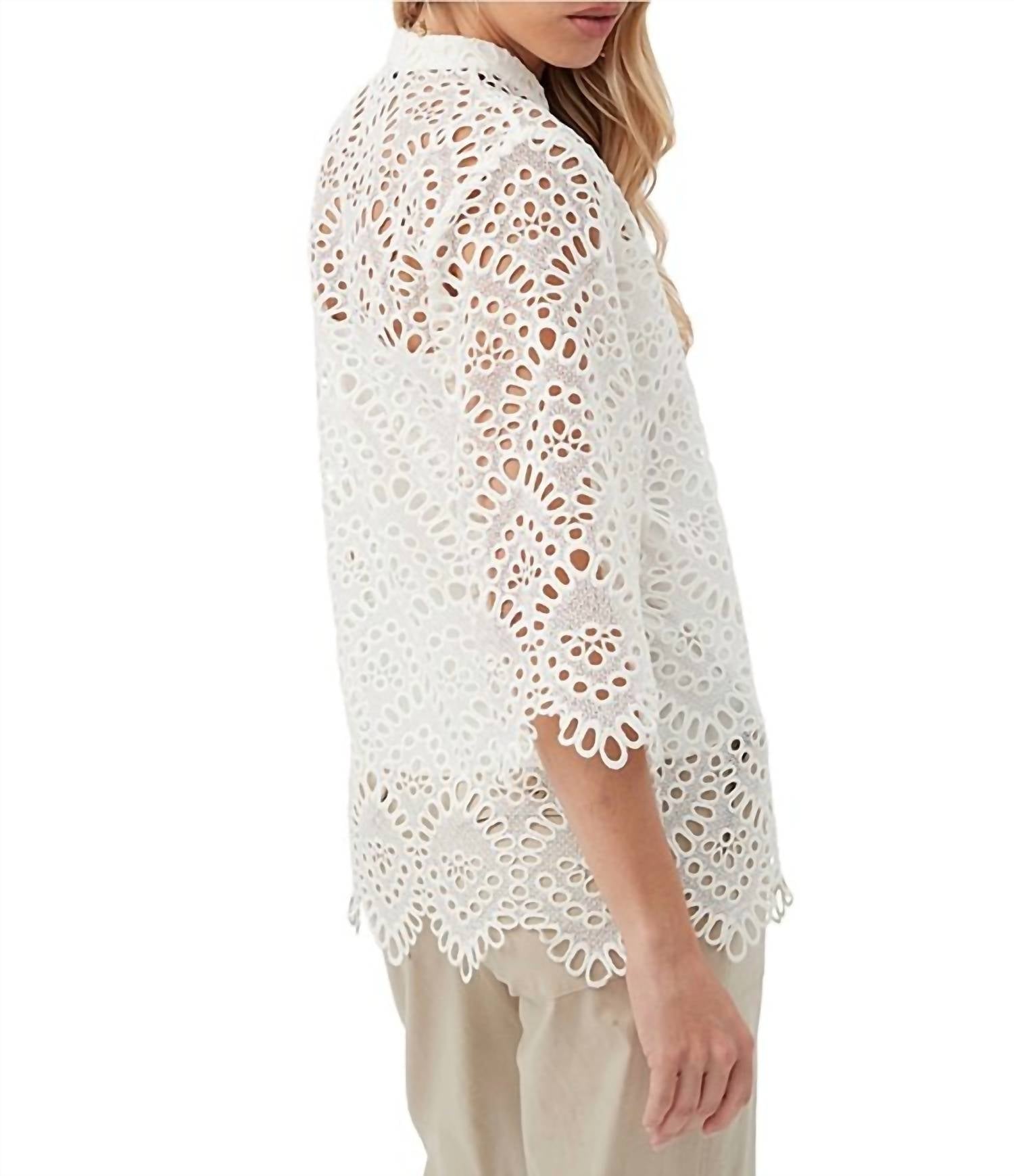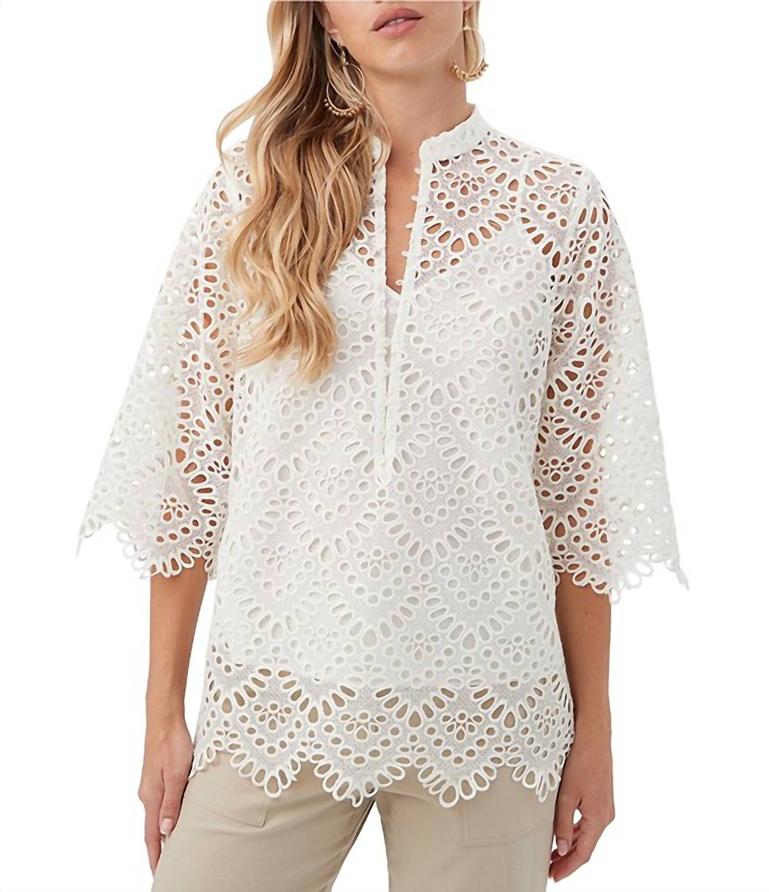 A timeless blouse that will never go out of style. The Martigues Woven Lace Top by Trina Turk is perfect for warm weather outings with its charming and feminine design. This blouse features elegant elbow-length sleeves and a stand collar with a button closure, accentuated by scalloped edging for a delicate touch. Crafted in 100% polyester, the top includes a removable cami lining and runs true to size. Care instructions: Machine wash. The top embodies quiet luxury, making it ideal for spring engagements.