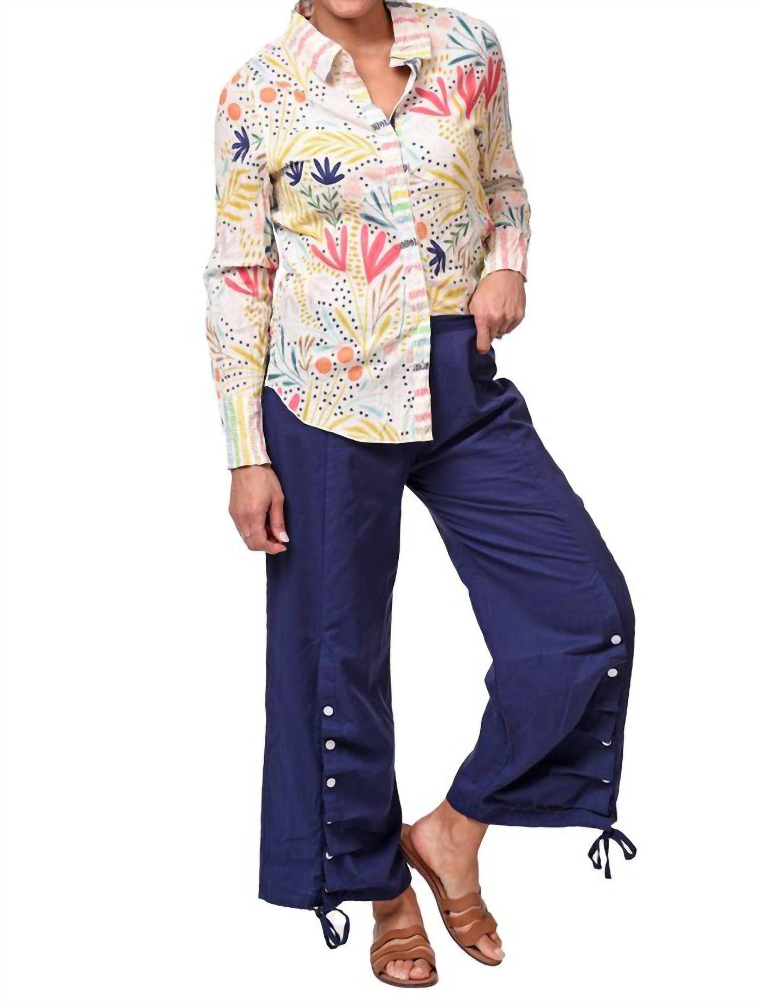 Pair this with your favorite jeans and slides for your next girls night out. Introducing the Gretchen Button Down Blouse by Tulip Clothing, a whimsical patterned piece that is perfect for any dinner party this spring. This long sleeve blouse made of 100% cotton features a charming ribbon trim and cuffs. With a button closure, it's designed to add a touch of flair to your wardrobe. Care is simple with a machine wash and line dry, and note that the fit runs smaller than standard Tulip sizes. Model is wearing a size small.